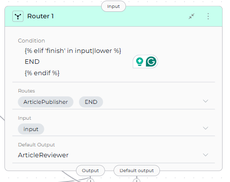 | Condition | Define the conditional logic that determines which route to take | Syntax: Template syntax (Jinja2-like) Operators: {% if condition %} - Start conditional block{% elif condition %} - Alternative condition{% else %} - Fallback condition{% endif %} - End conditional blockState Variables: Use variable names directly (e.g., input, status, user_type)Filters: \|lower, \|upper, in operator for substring matchingExample: {% if 'approved' in input|lower %} ArticlePublisher {% elif 'finish' in input|lower %} END {% endif %} |