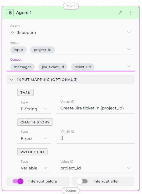 | Custom Variables (Input Mapping) | Map agent-specific custom variables if defined | Fixed - Static valueF-String - Value with variablesVariable - Value from stateExample (if agent has jira_project):jira_project: PROJ-123 |
