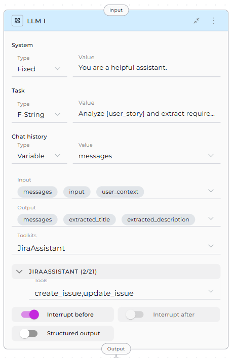 | Output | Define which state variables the agent's response should populate | Default: messagesCustom states: Specific variables Example: - jira_ticket_id- ticket_url- messages |
