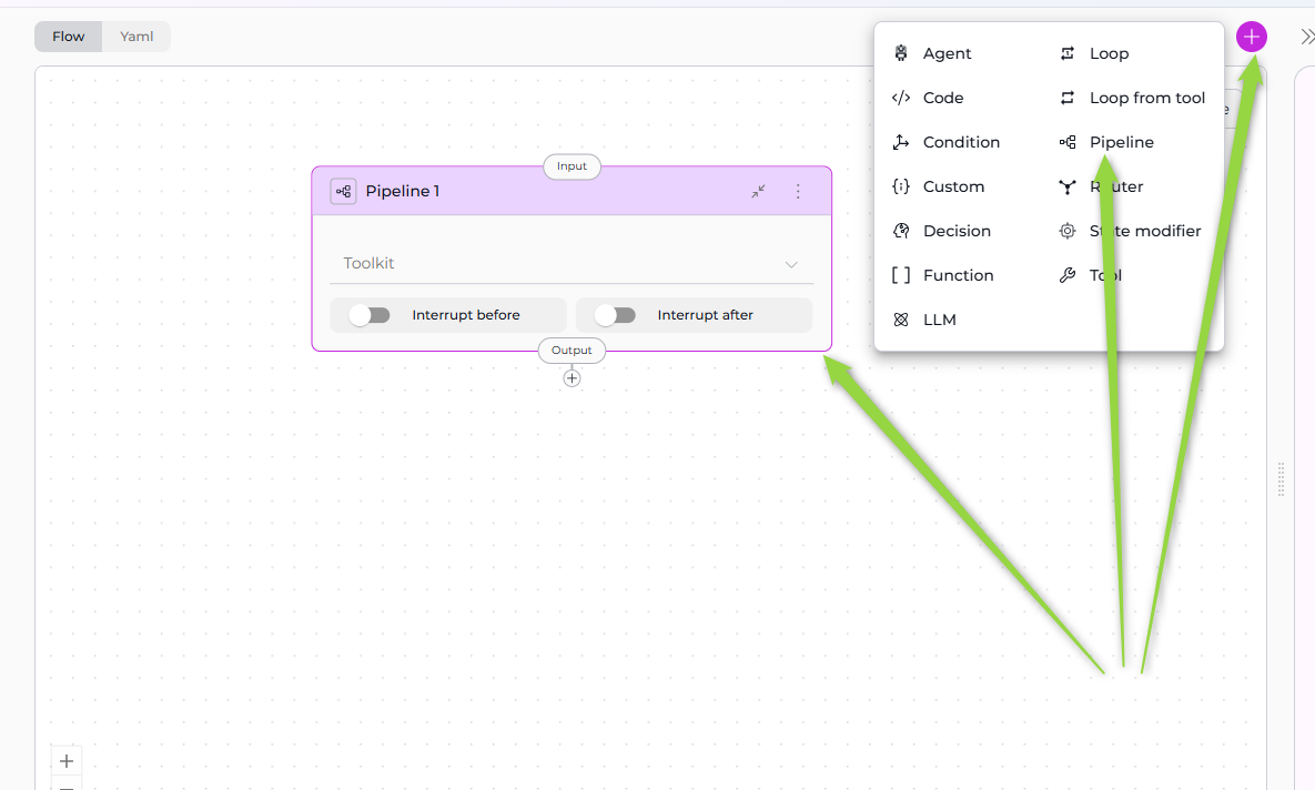 | Pipeline | Select the pipeline to execute as a subgraph | Options: Only pipelines can be selected (no Toolkits, MCPs, or Agents) Selection: Dropdown shows all available pipelines in your workspace Requirements: Pipeline must exist and be accessible YAML Field: toolExample: tool: Bug Analysis PipelineExecution Flow: 1. Parent pipeline invokes child pipeline 2. Child pipeline executes completely 3. Child pipeline completes and returns control 4. Parent pipeline continues to next node |