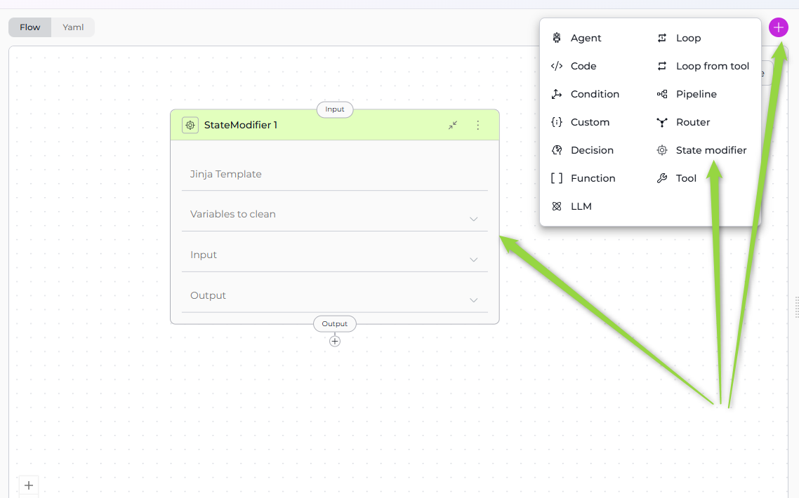 The State Modifier Node updates, transforms, or cleans up parts of the workflow's state using Jinja2 templates. Think of it as a "state editor" that can modify variables, generate new content from templates, or reset portions of the state to prepare for subsequent nodes.