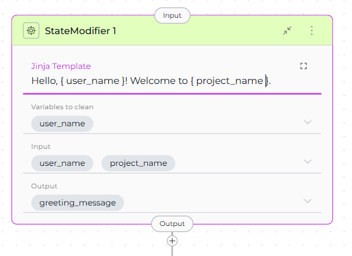| Output | Specify which state variables should be updated with the rendered template result | Options: - New state variables (will be created) - Existing state variables (will be overwritten) Example: output: ["greeting_message"]Output Behavior: The rendered template result is stored in the output variable(s) |