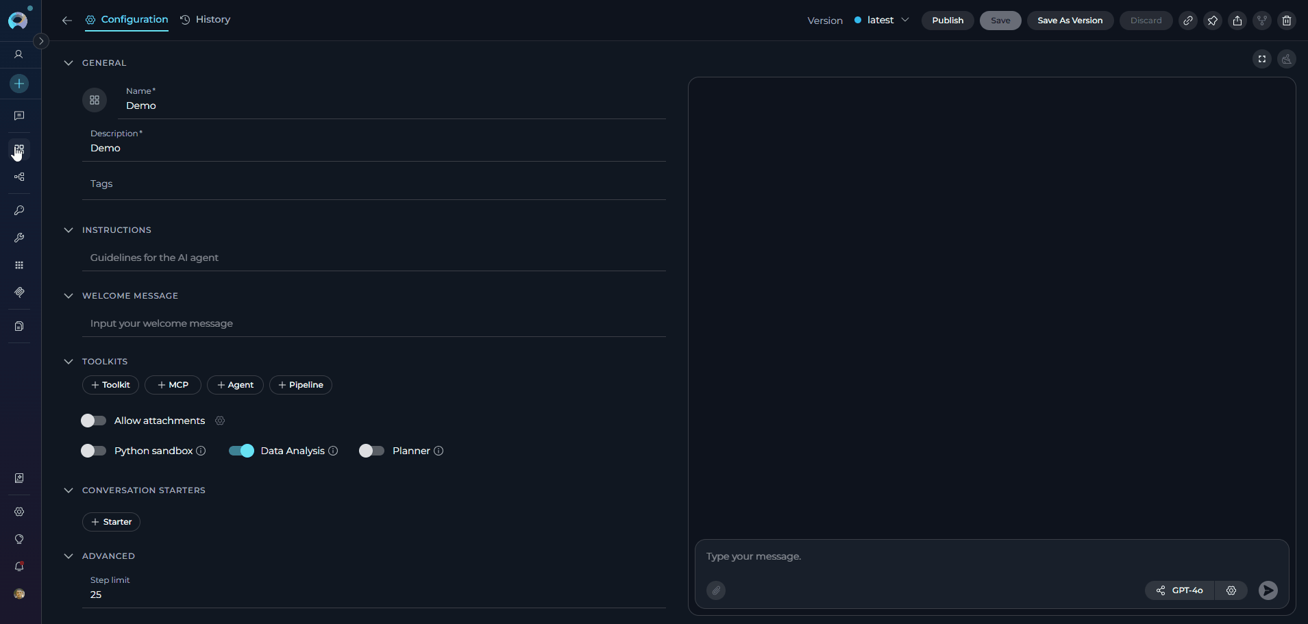 - PgVector Configuration: Select a PgVector connection for vector database integration