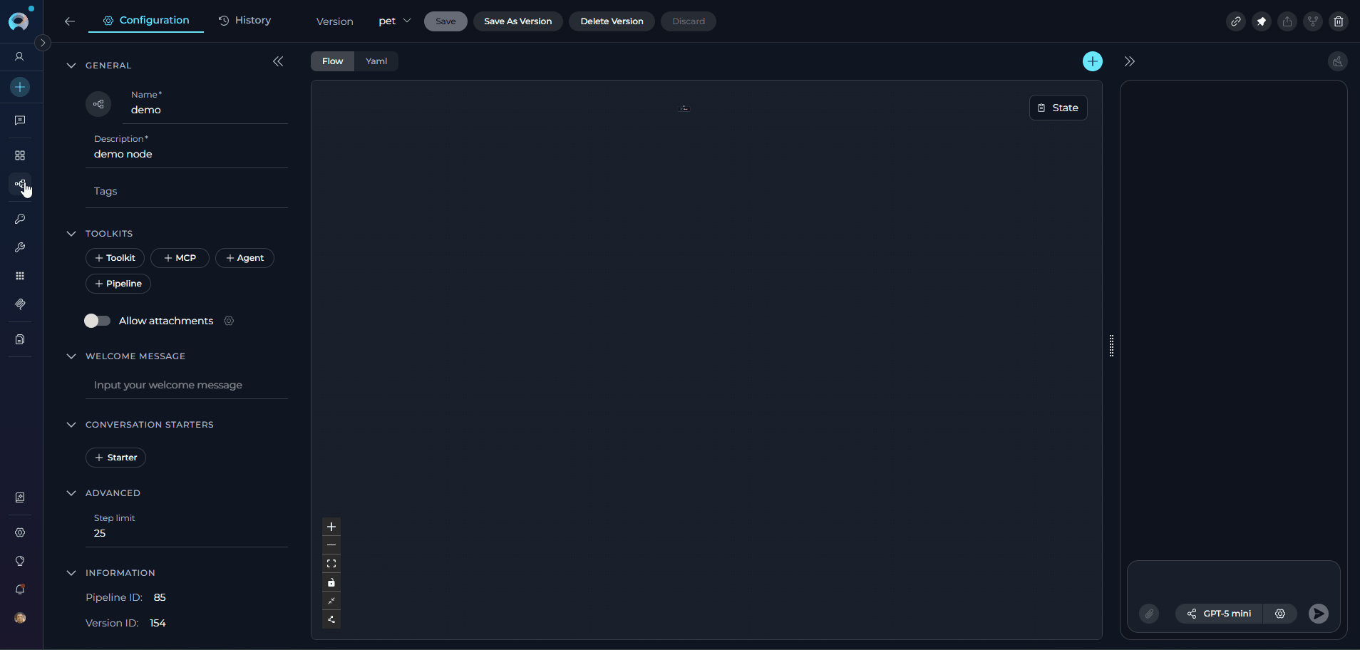 - PgVector Configuration: Select a PgVector connection for vector database integration