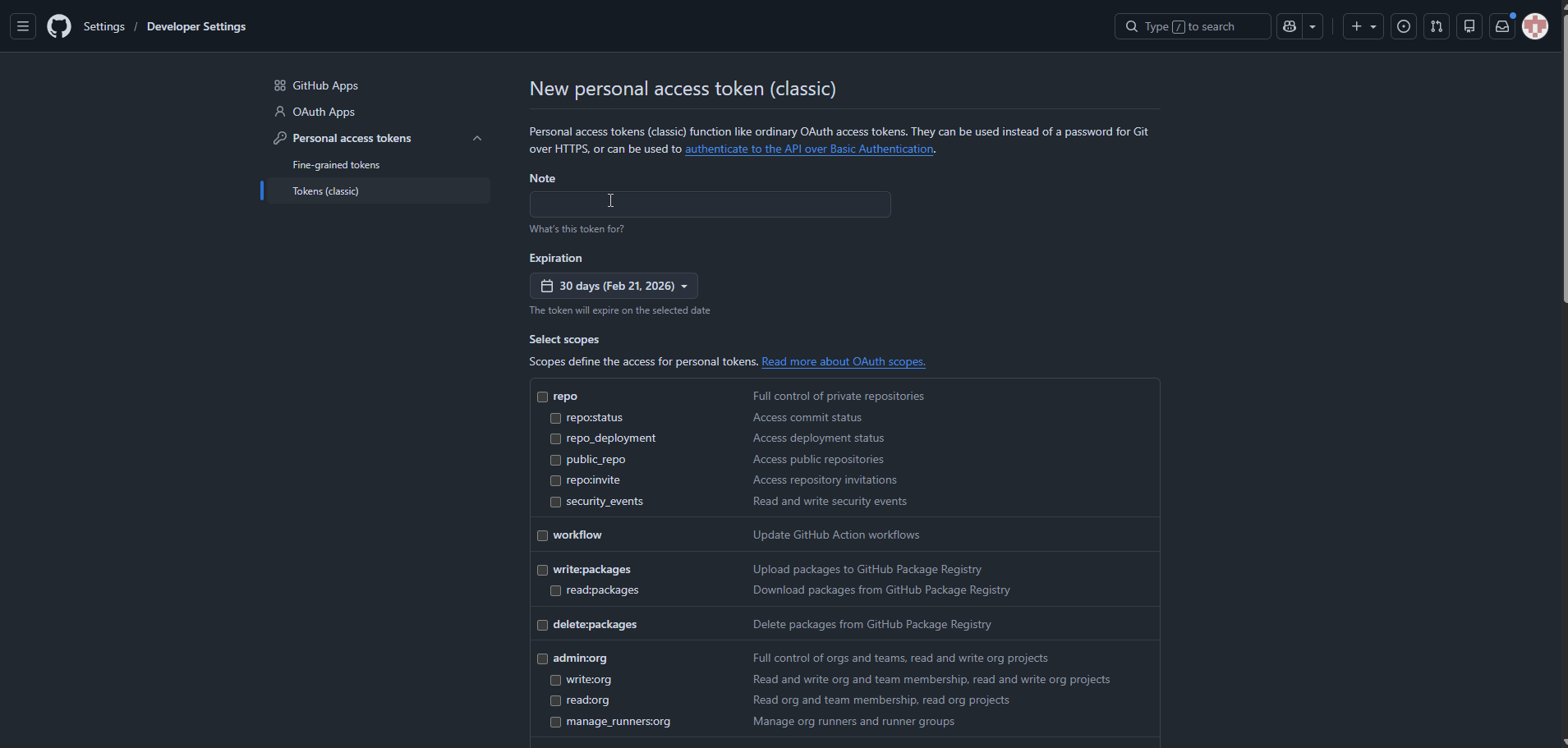 Generate a Personal Access Token (Classic)¶