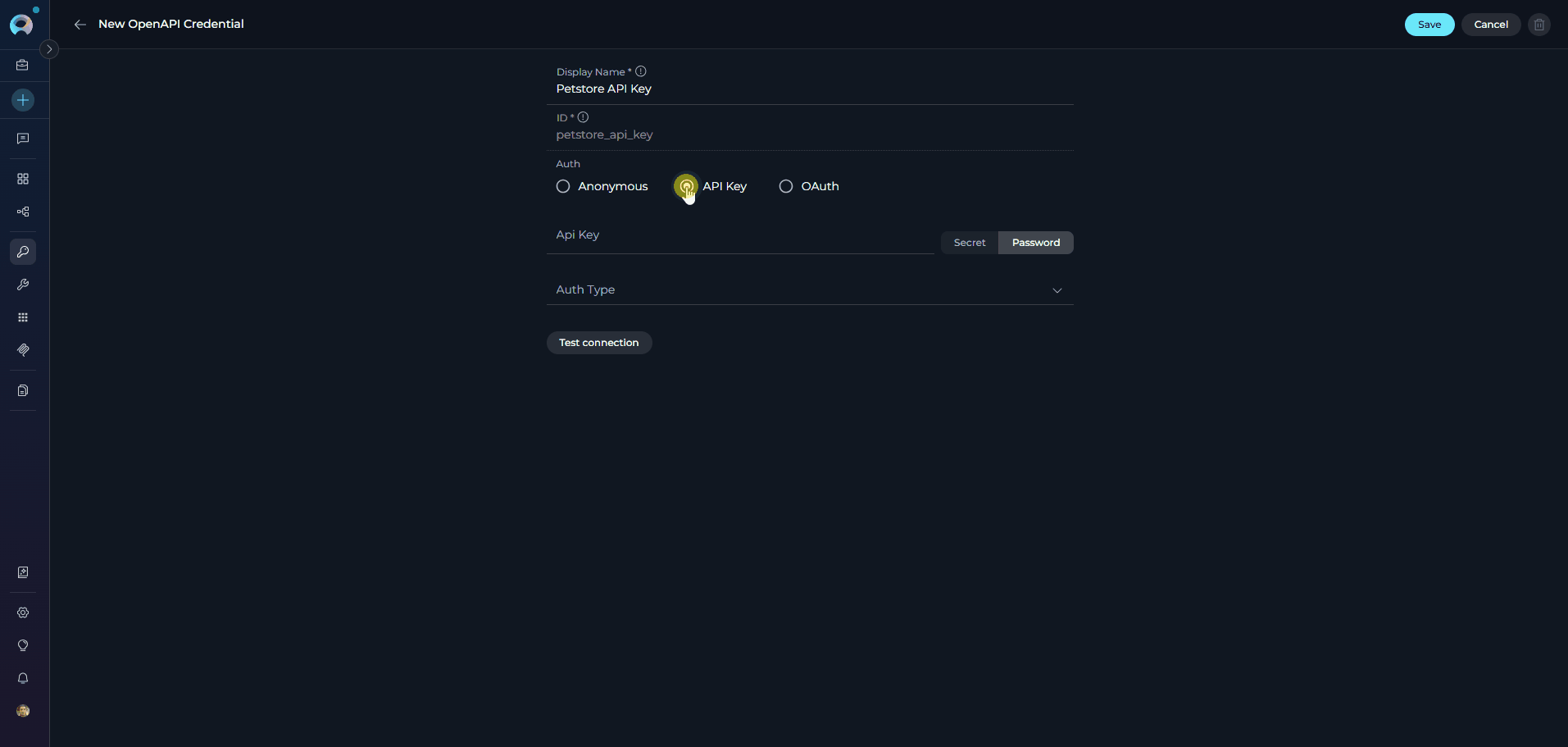 It's highly recommended to use Secrets for API keys and sensitive values instead of entering them directly. Create a secret first, then reference it in your credential configuration.