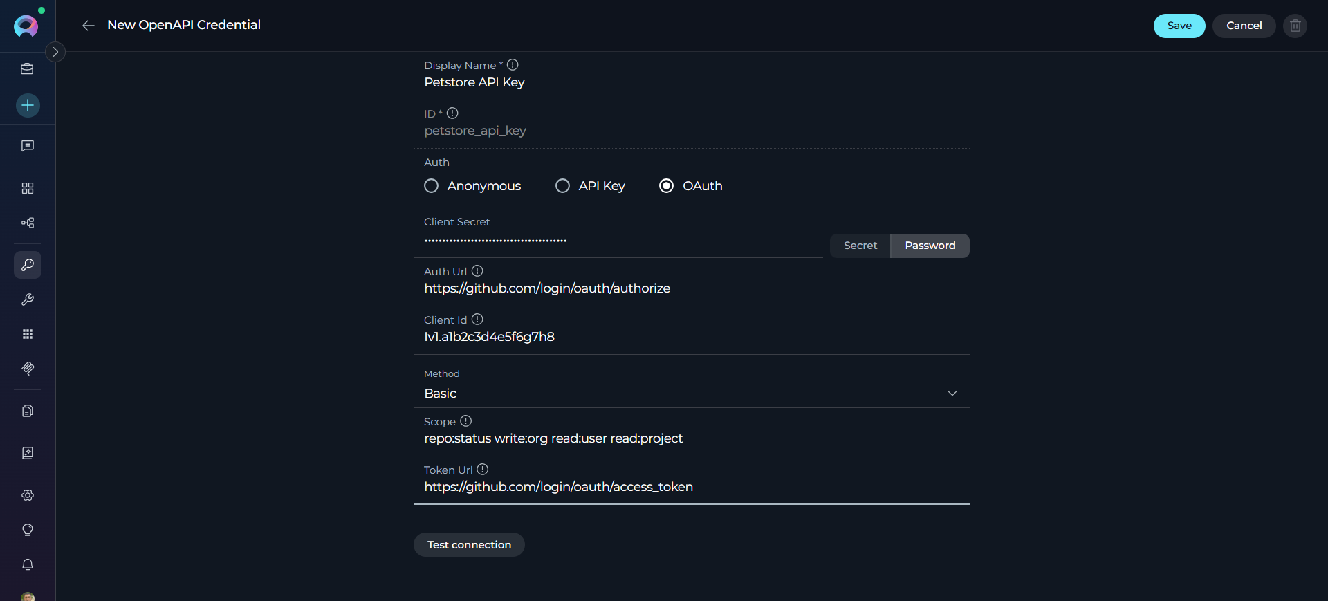 | client_secret | Yes | Your OAuth application's client secret (confidential key). This proves your application's identity to the authorization server. Never share or commit this to code! Stored as SecretStr (encrypted). Recommended: Use ELITEA Secrets instead of direct entry. | GitHub: ghp_1234567890abcdefghijklmnopqrstuv |