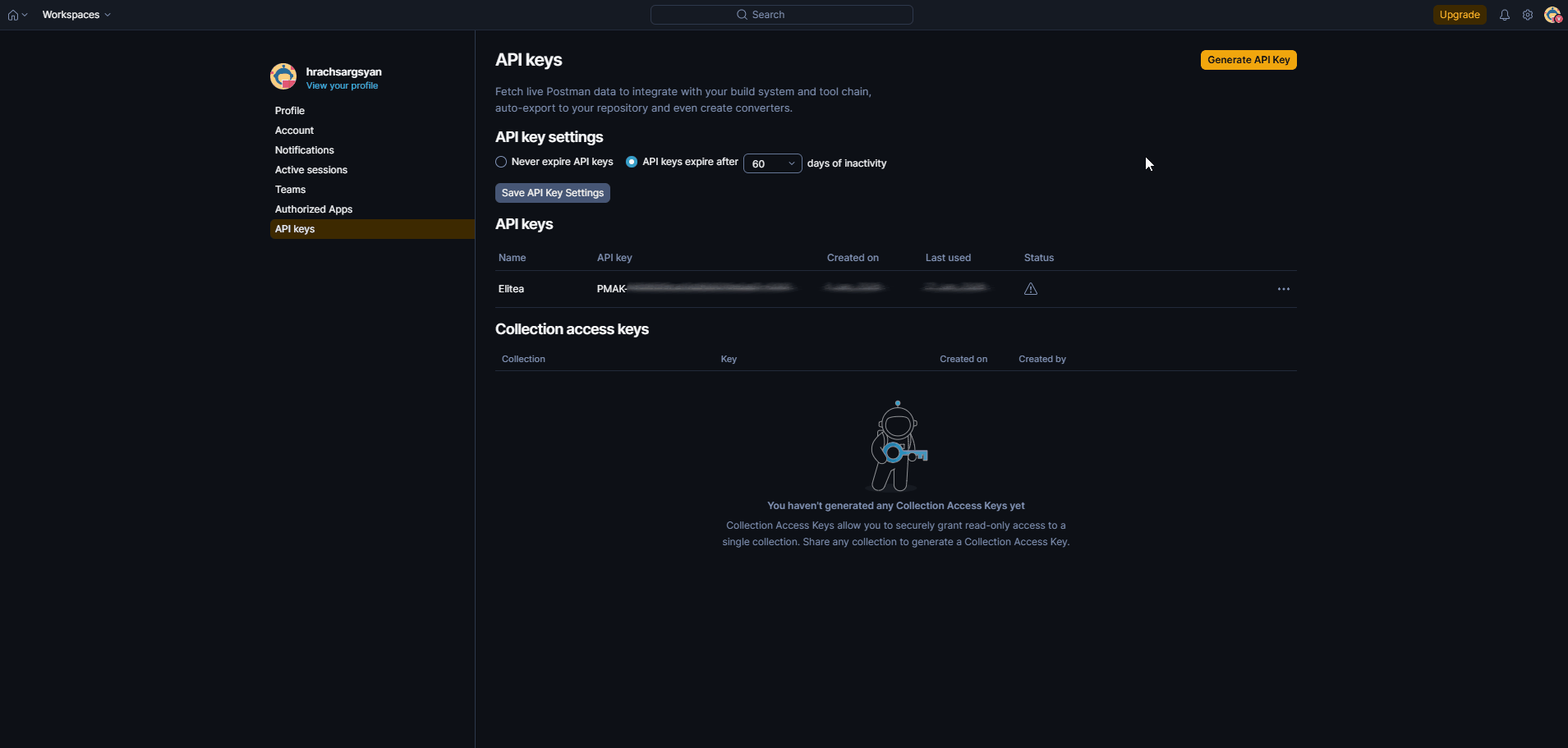 - In the Postman app: Click your profile icon in the top-right corner → "Settings" → "API Keys" tab.