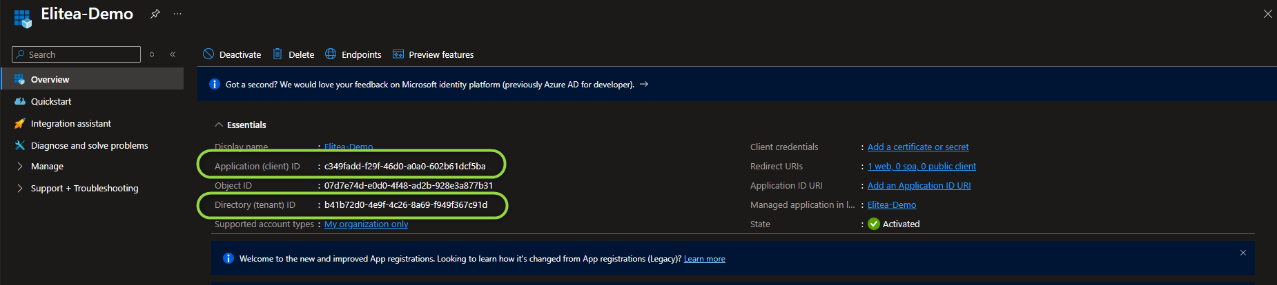 Once the app registration is created successfully, you will be redirected to the application's Overview page. Note down the following credentials, as you will need them to configure the SharePoint toolkit in ELITEA:
