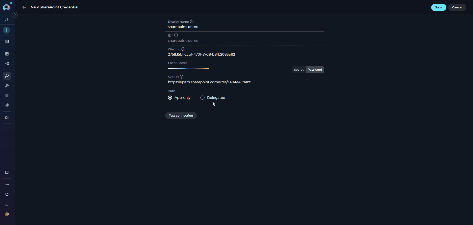 - Test Connection: Click Test Connectionto verify your credentials are valid and ELITEA can connect to SharePoint.