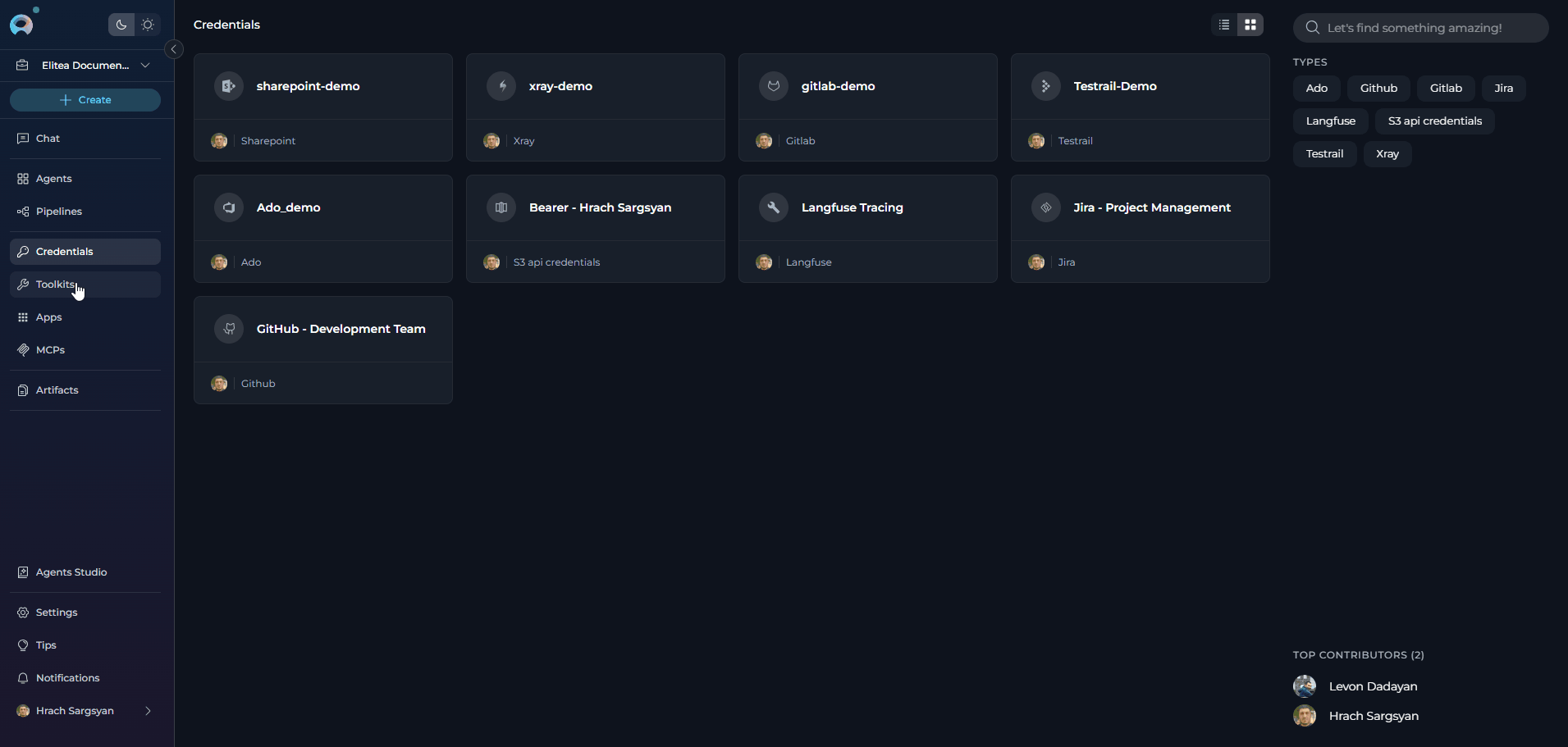 Before creating a toolkit, you must first create SharePoint credentials in ELITEA.