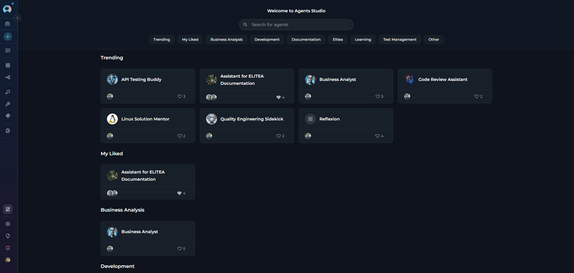 The Agents Studio is a dedicated shared library menu in ELITEA that provides centralized access to community-published agents. Similar to ChatGPT's GPTs marketplace, Agents Studio serves as a discovery hub where you can browse, search, and instantly use pre-built AI agents created by the ELITEA community.