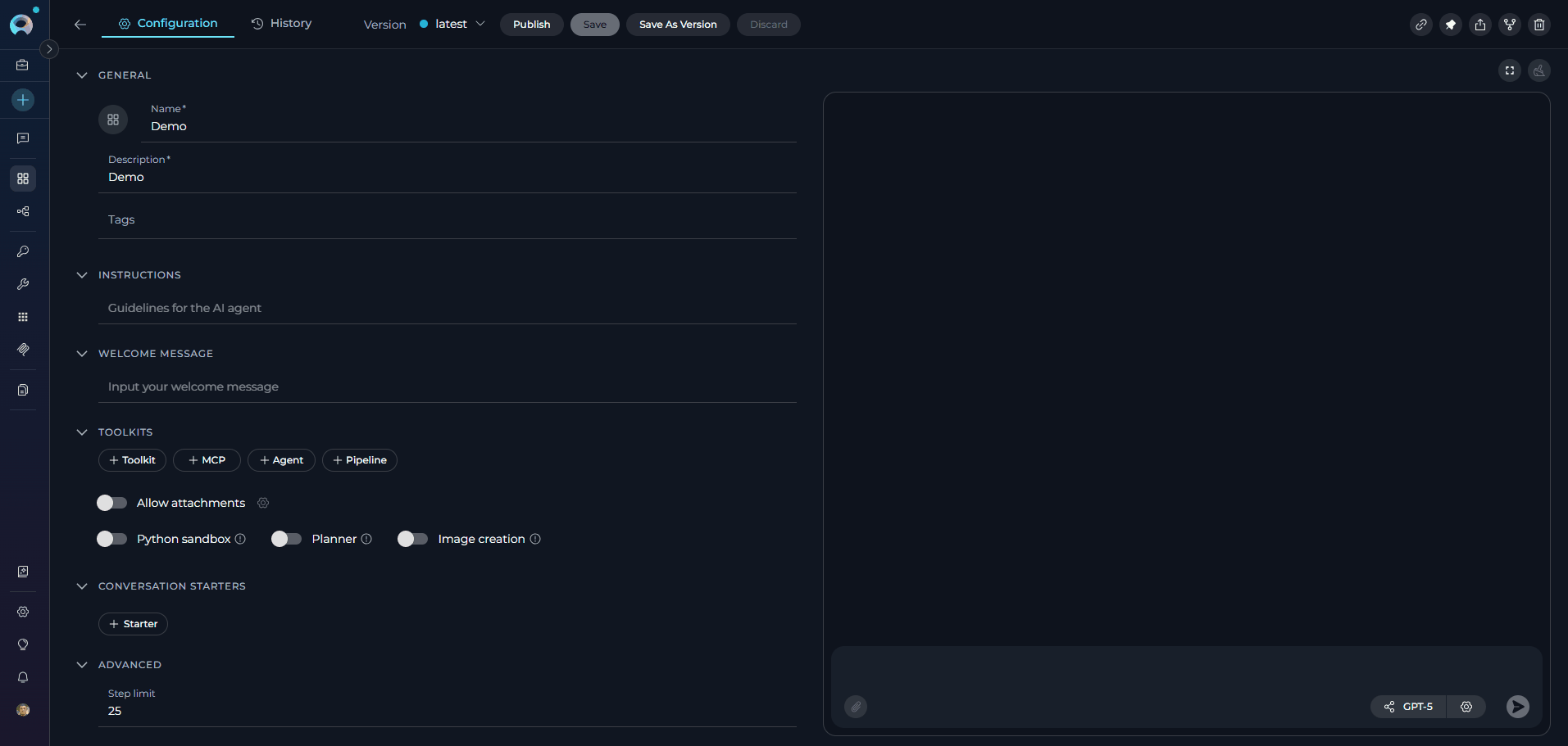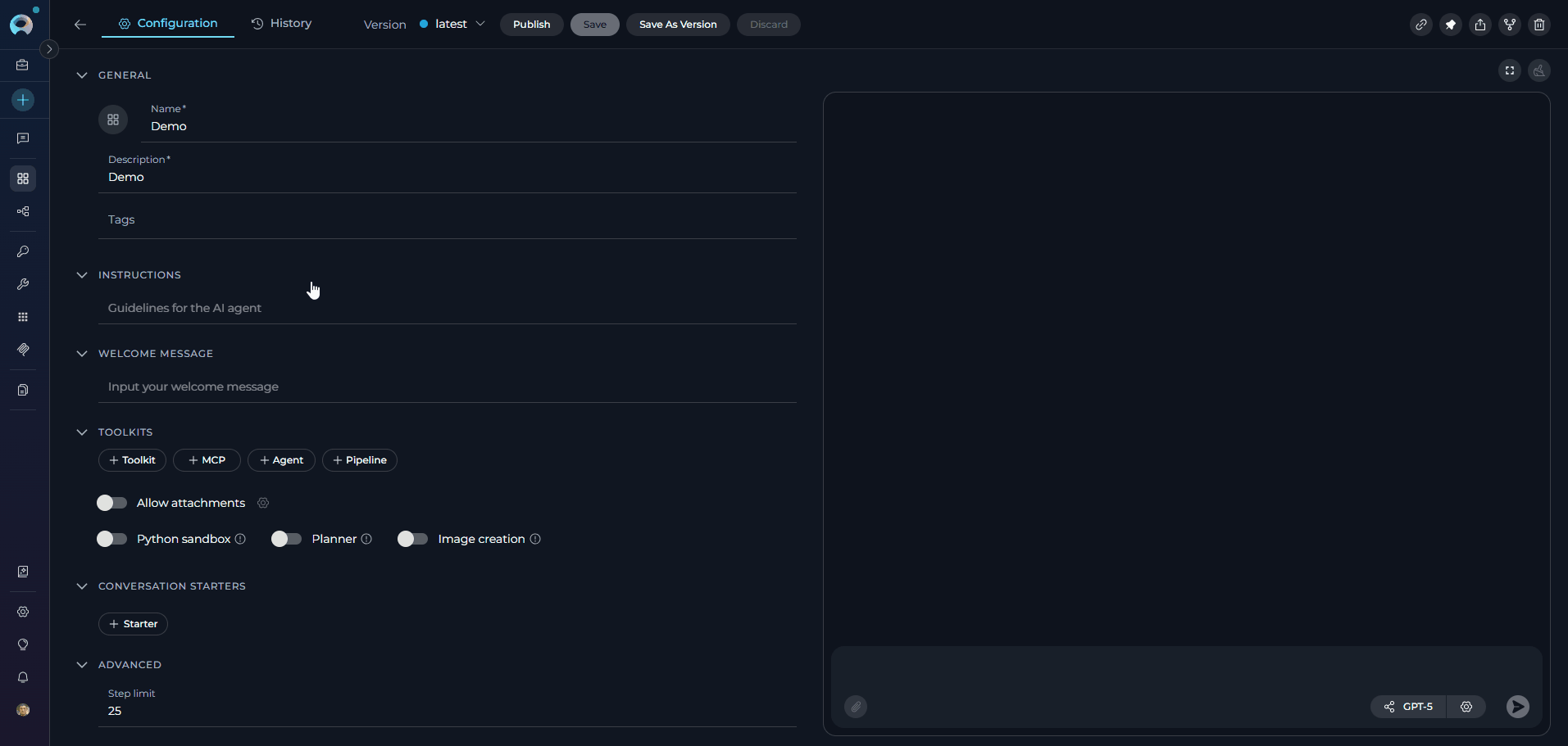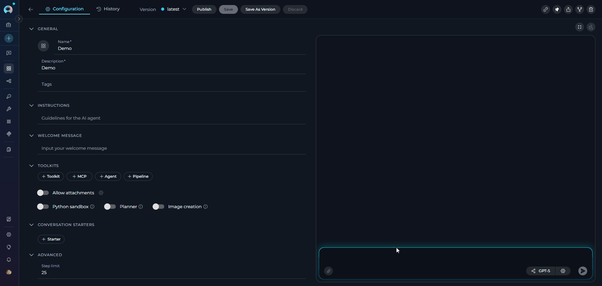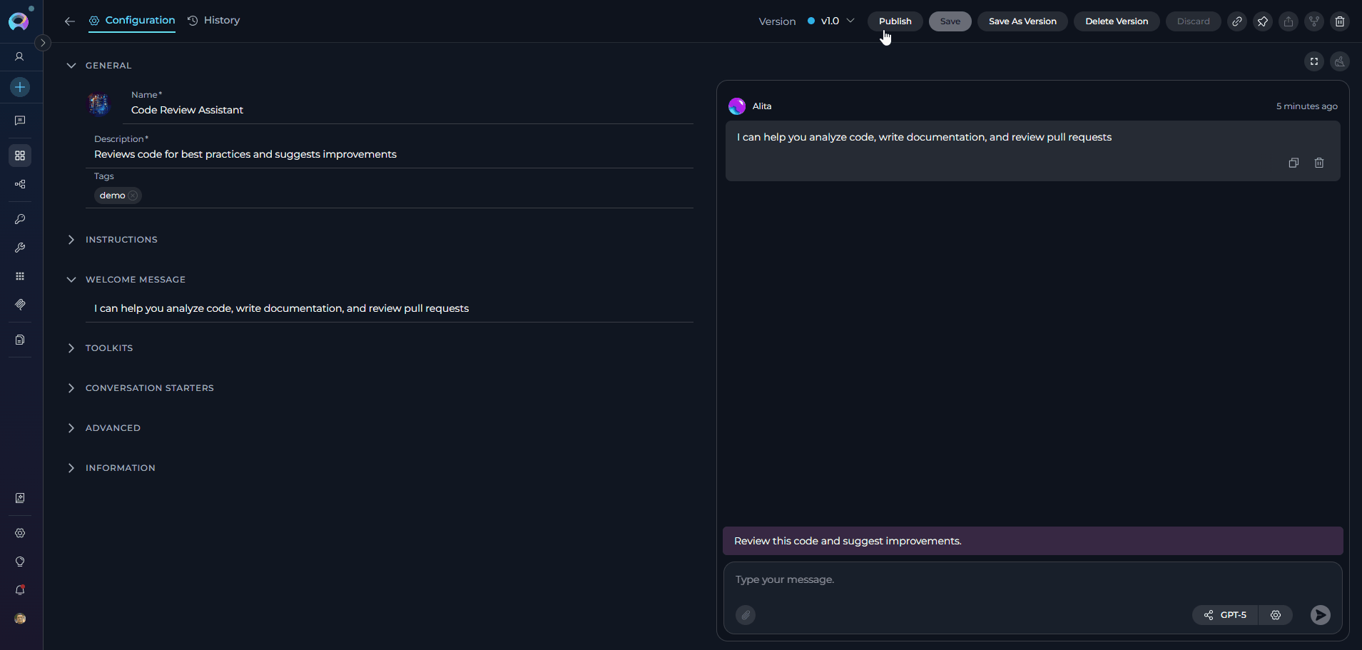 - Version Management: Create, manage, and publish different versions of agents for various use cases