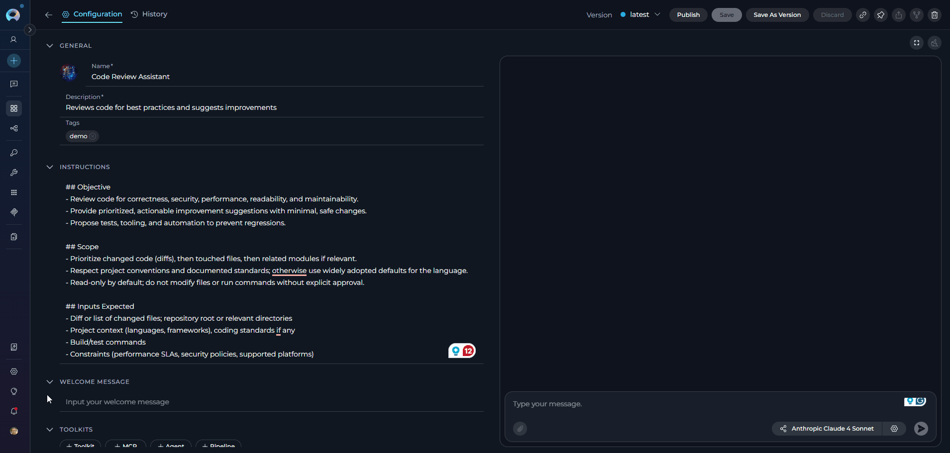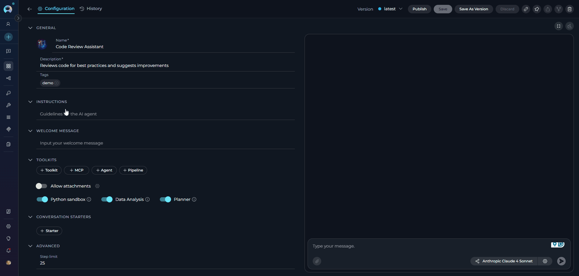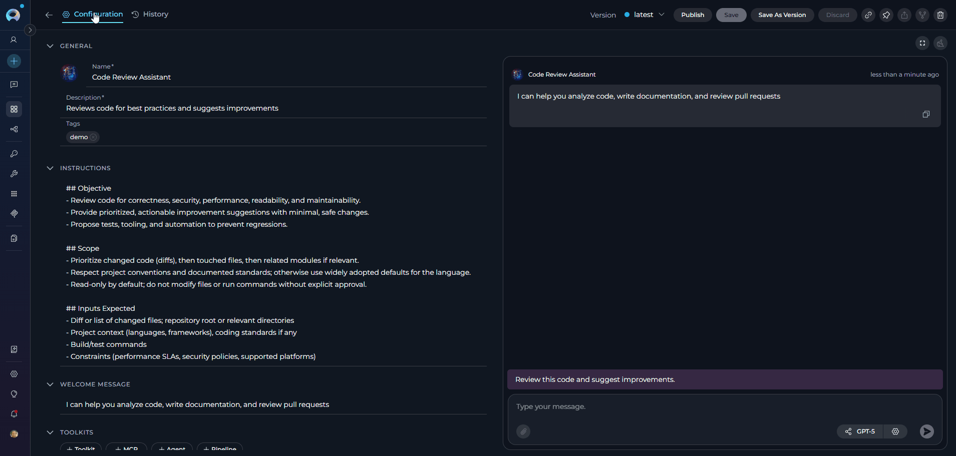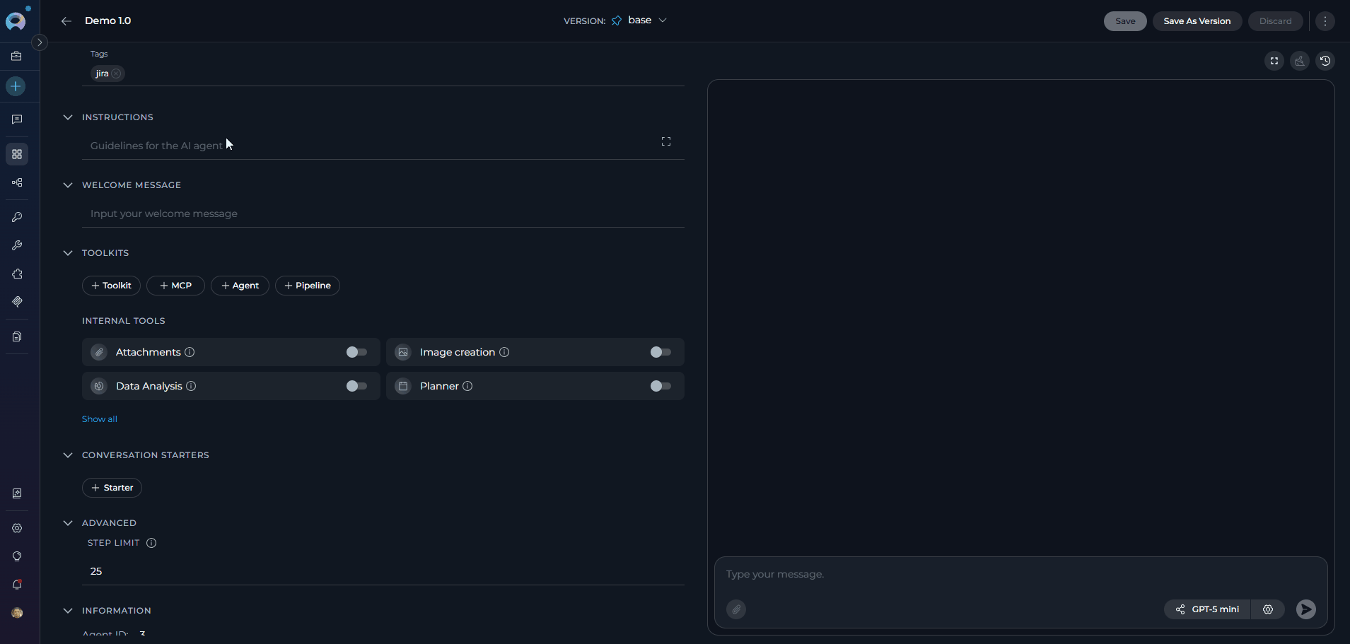 - Version Management: Create, manage, and publish different versions of agents for various use cases