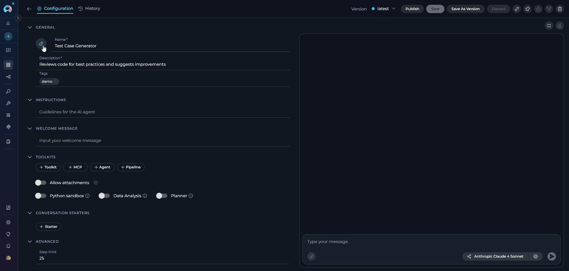 - You can continue to modify your agent and save the changes to the "latest" version at any time by clicking the Save button again. If you wish to discard any changes made, you have the option to click the Discard button before saving.