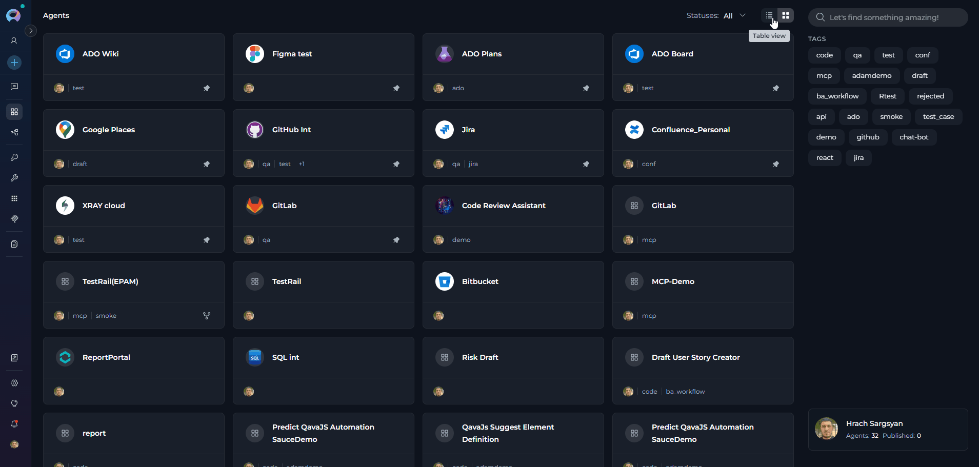 - Card View - Visual cards displaying agent name, description, and key information. Ideal for browsing and quick identification.