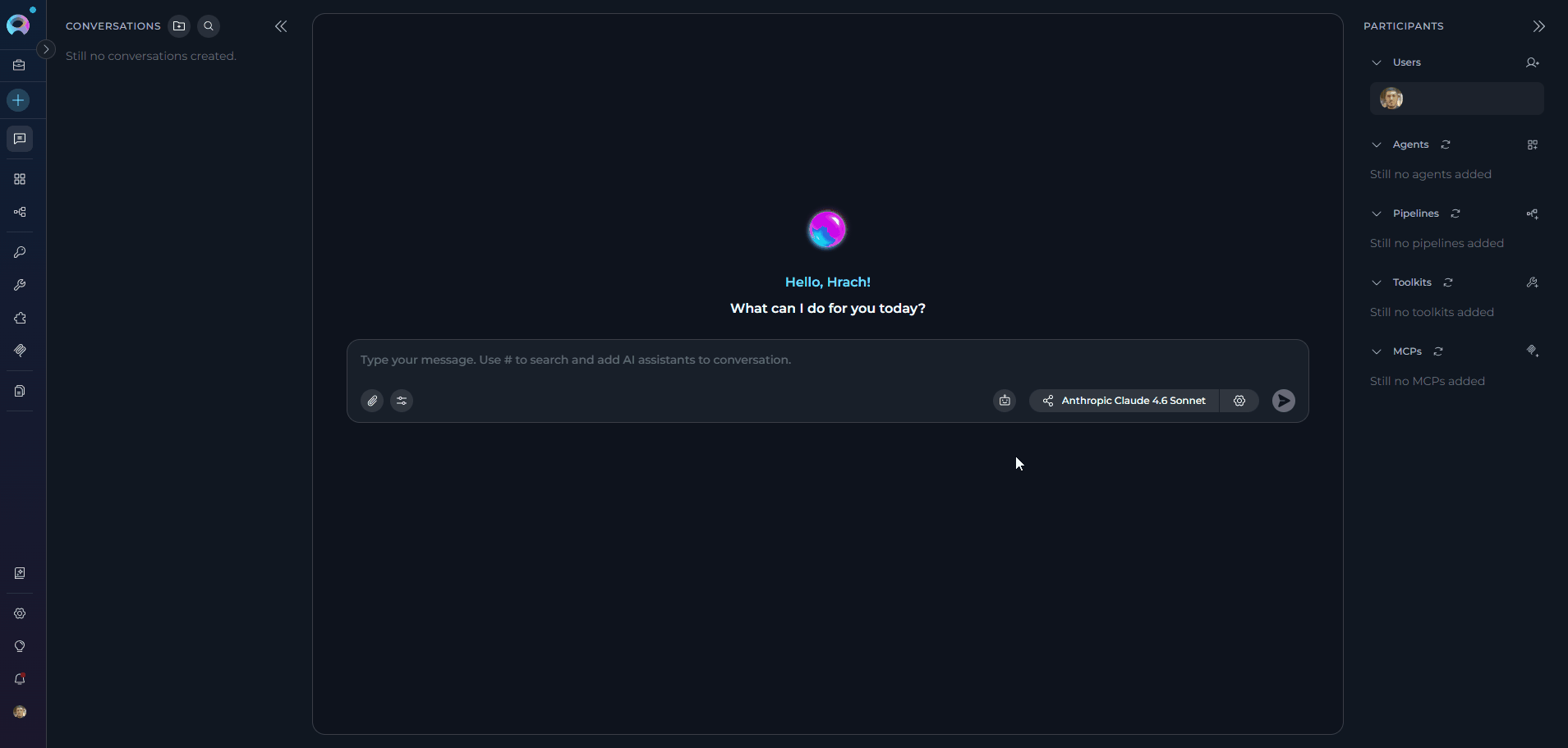 You can optionally add participants (agents, pipelines, or models) before sending your first message by typing # followed by the participant name, or by using the participant panel on the right.