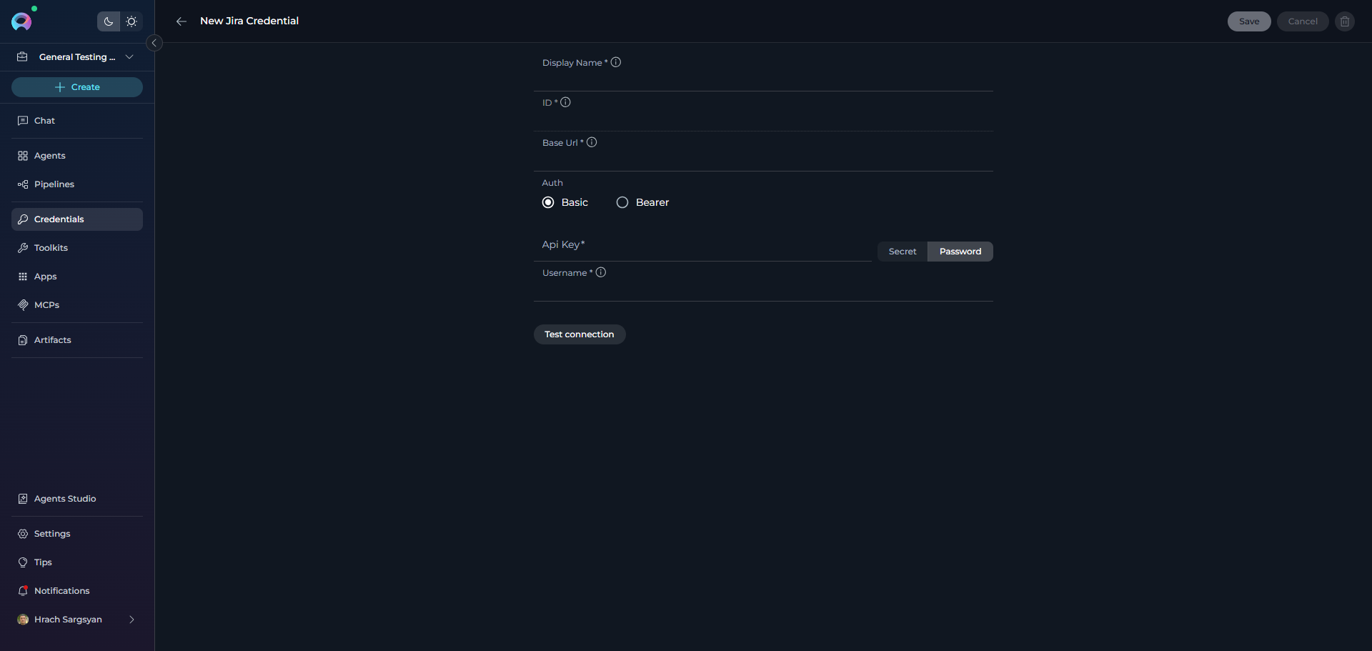 Once a credential is created, it is available for assignment when configuring toolkits or agents: