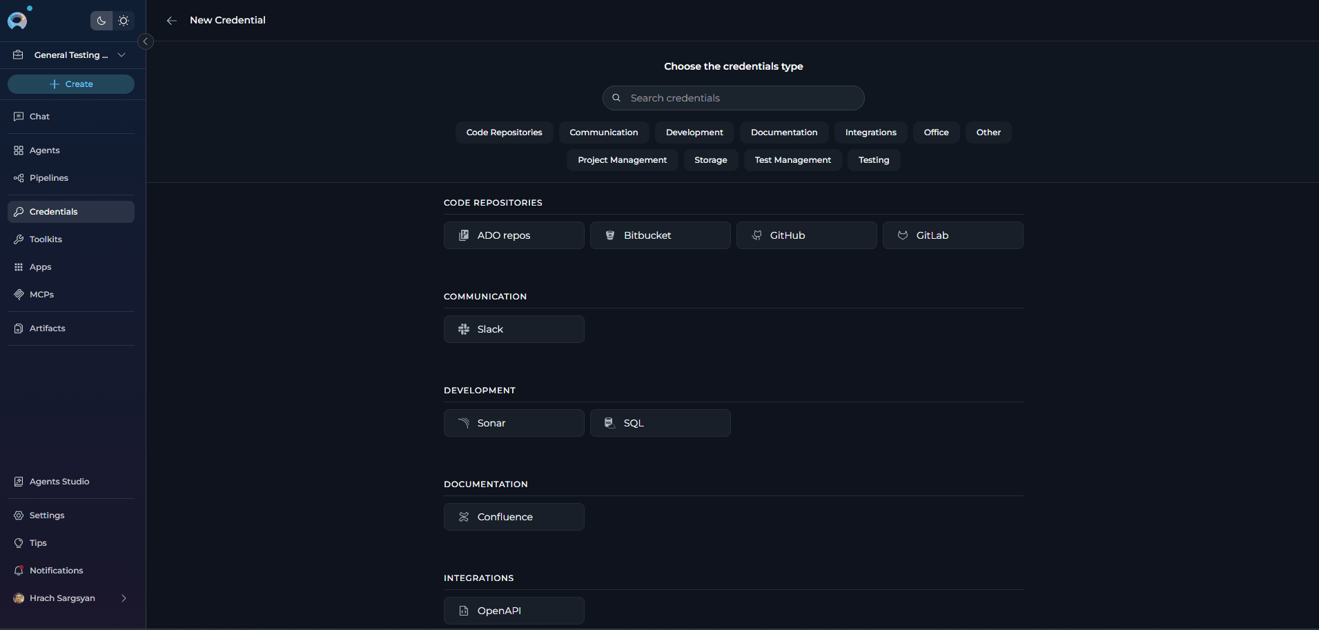 The ELITEA platform currently supports the following credential types, organized by category to help you quickly find the integration you need: