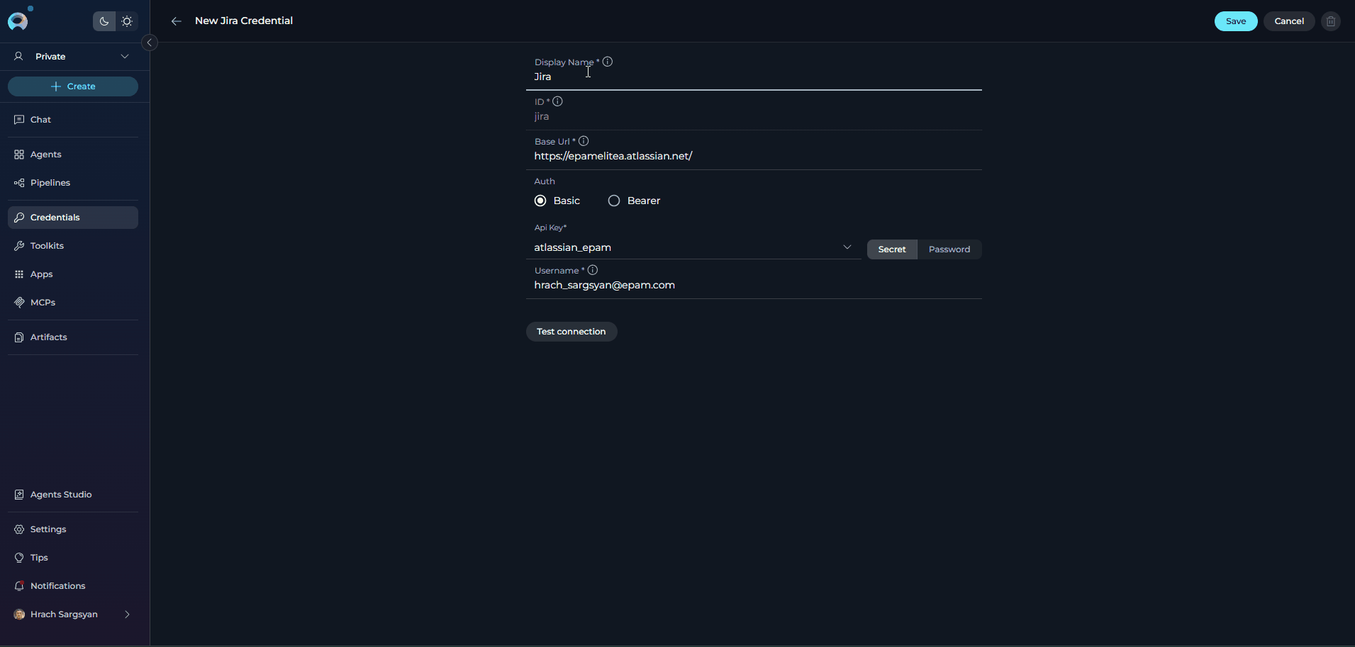 Credentials in ELITEA are secure records containing sensitive information—such as API keys, OAuth tokens, usernames, or passwords—used to authenticate your agents and toolkits with external platforms. By storing credentials centrally, ELITEA helps ensure secure access control and simplifies credential management across all your integrations.