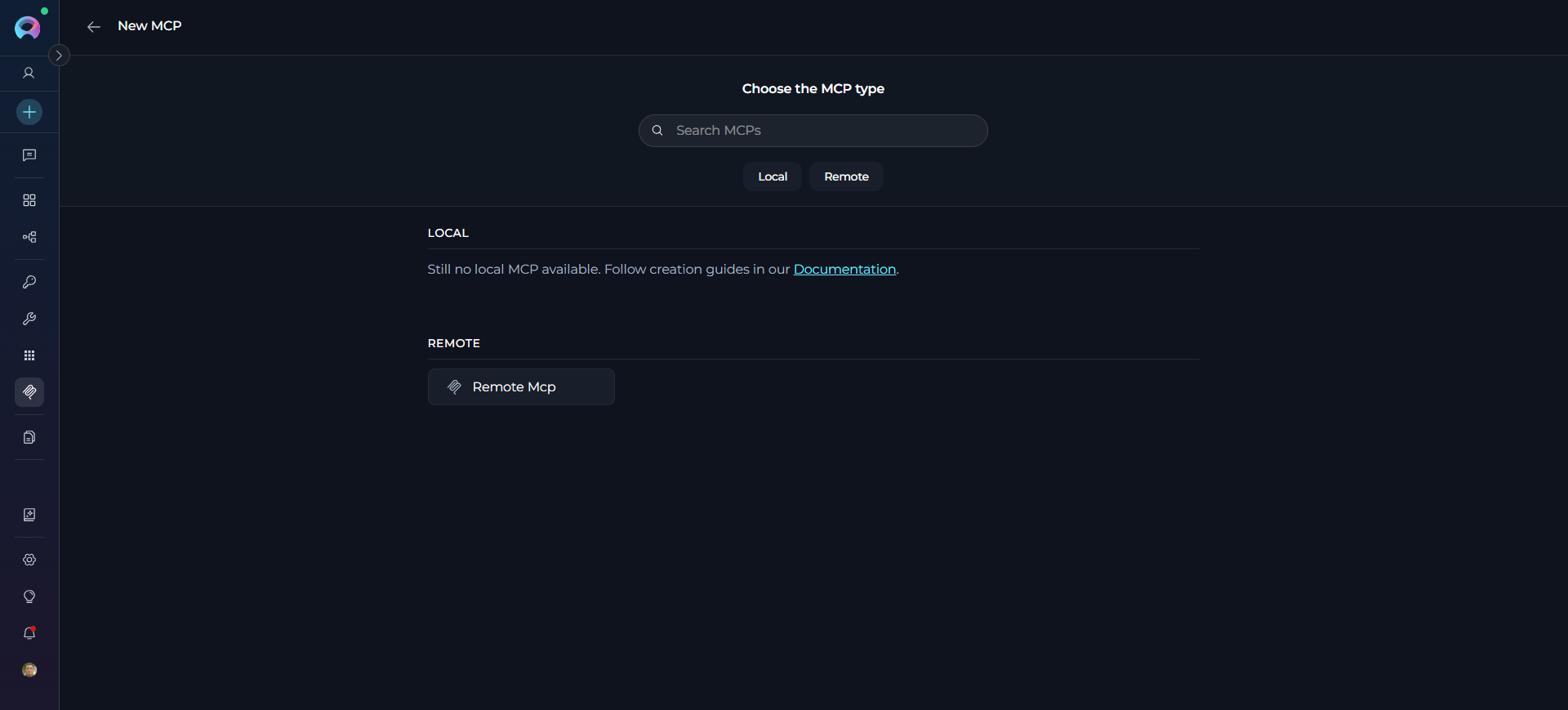 If no local MCP servers are available, you'll see a message: "Still no local MCP available. Follow creation guides in our Documentation." with a link redirecting you to the MCP Client Integration Guide for installation and setup instructions.