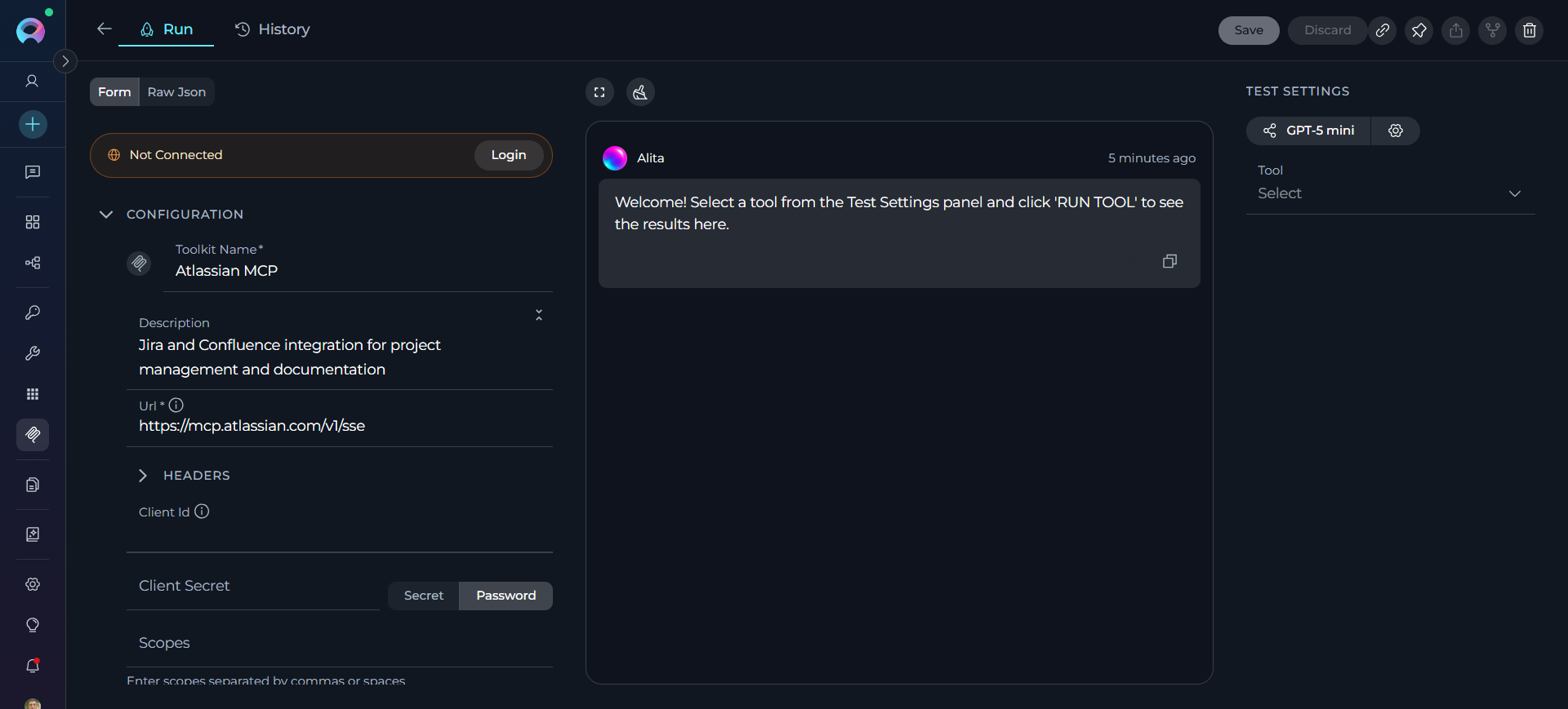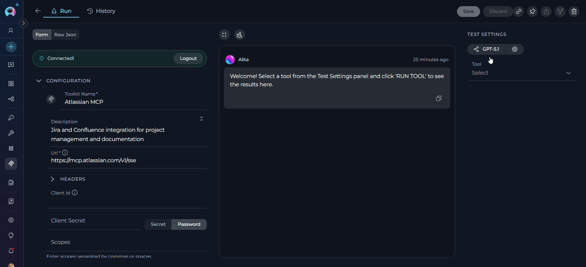 The Run Tab is where you configure the MCP's connection settings and manage enabled tools.
