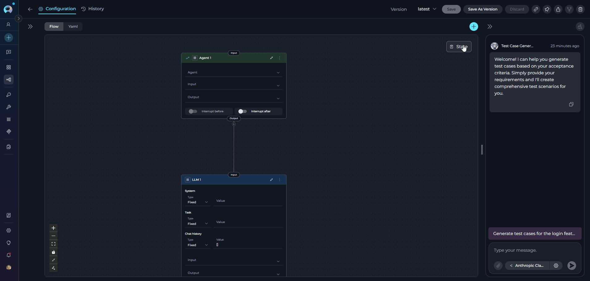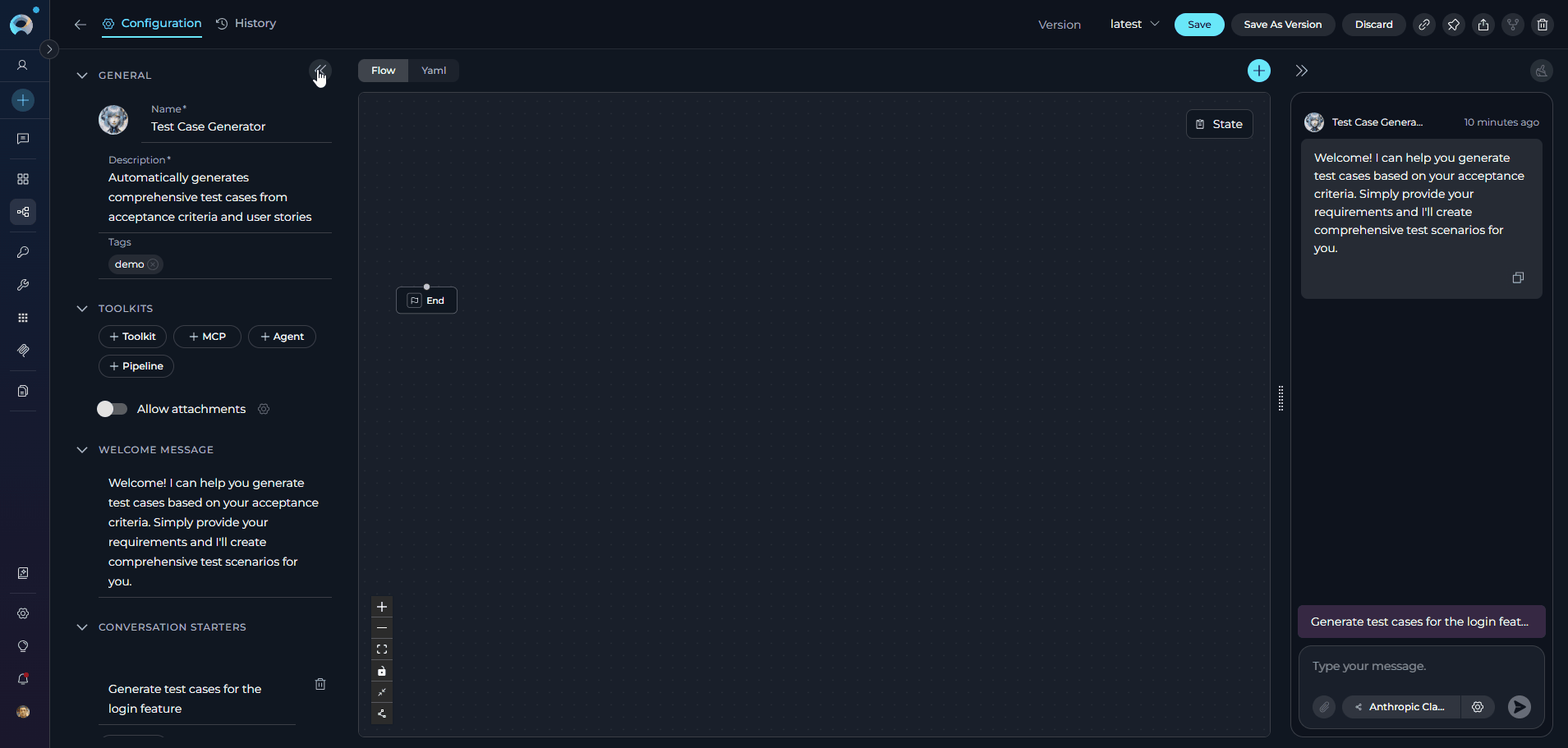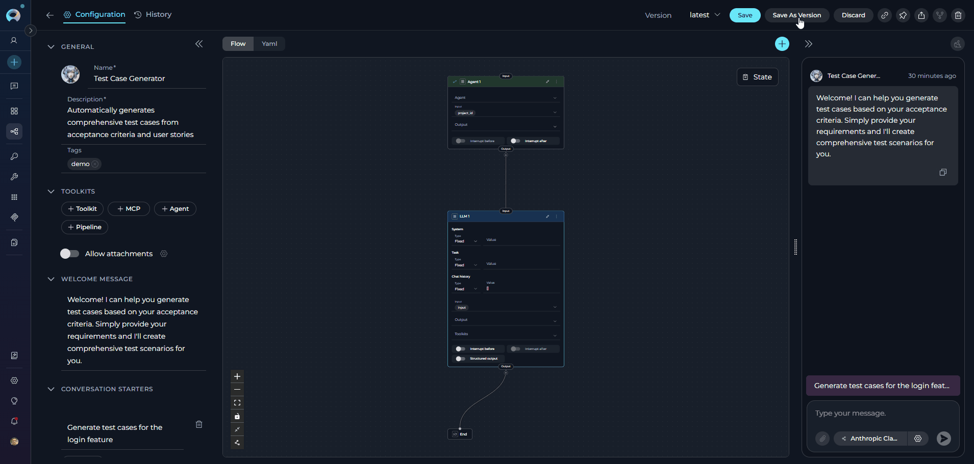 - Welcome Message: Define a welcome message to guide users interacting with the pipeline. (e.g., "Welcome! I can help you generate test cases based on your acceptance criteria. Simply provide your requirements and I'll create comprehensive test scenarios for you.")