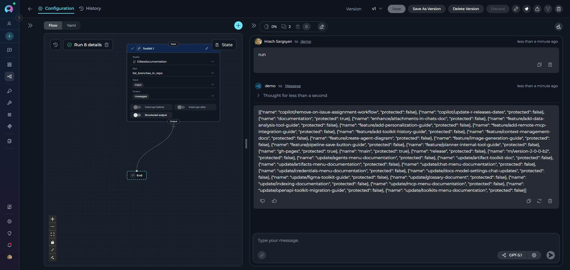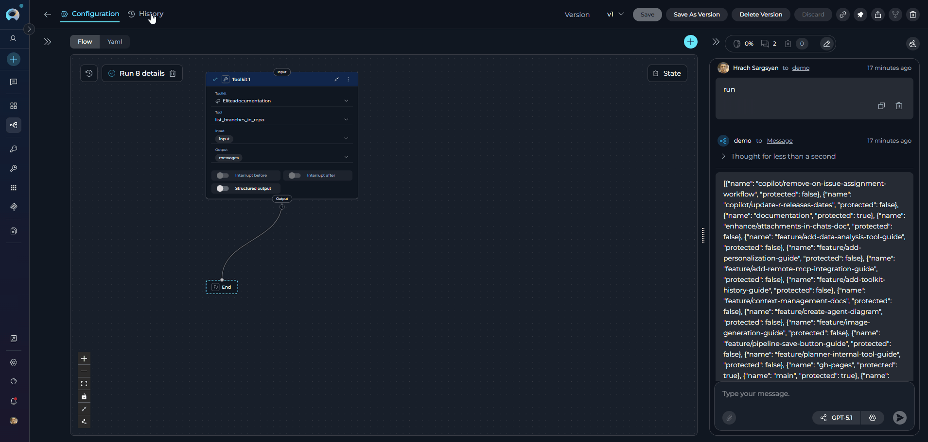 - Review past conversations: View complete chat histories from previous pipeline runs