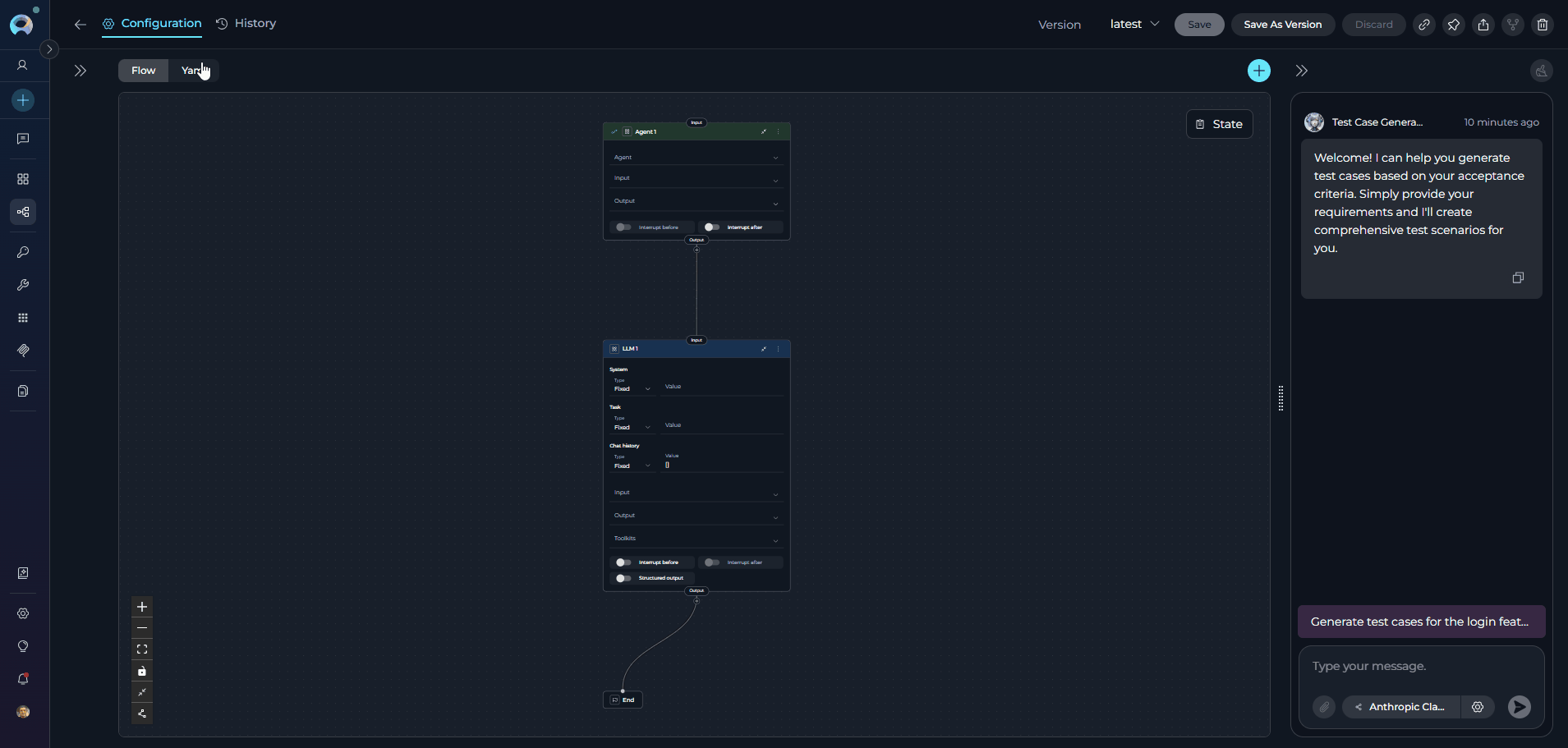 - Visual or Code Configuration: Use the Flow Designer for visual workflow creation or switch to YAML Editor for advanced programmatic configuration