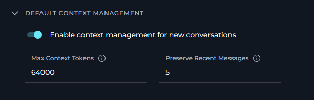 The Enable context management for new conversations toggle is turned off. When context management is disabled, the token and message fields are intentionally disabled because they have no effect without context management active.