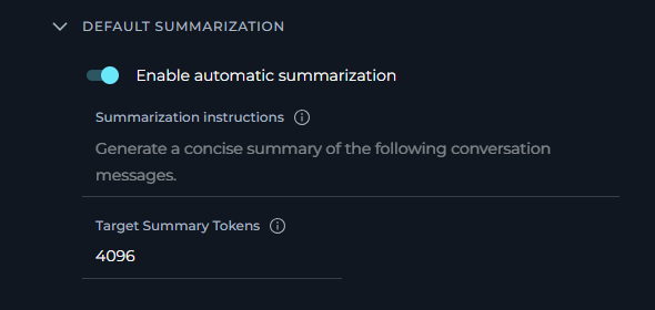 | Default Summarization | Automatically condense long conversations | Enable Toggle, Summarization Instructions, Target Summary Tokens | During conversation when thresholds reached | ✔️ Yes (via Context Budget widget) | ✔️ |