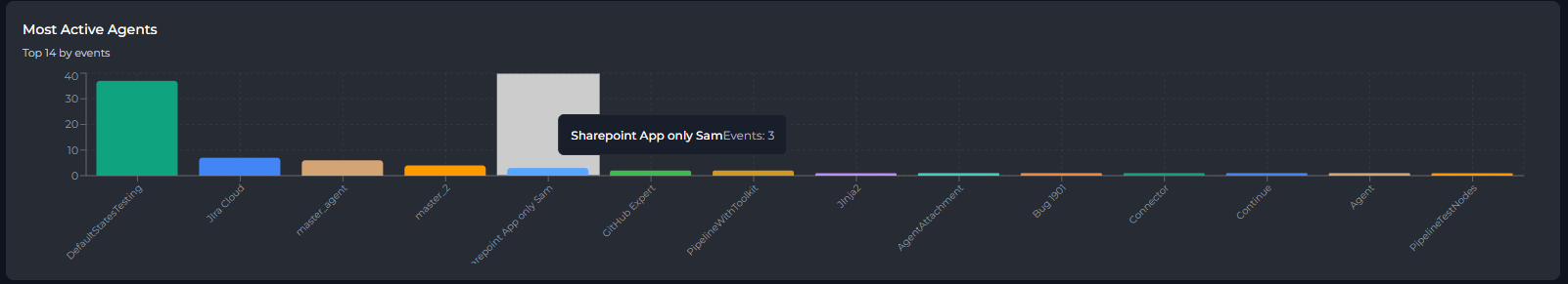 | Top charts limited to 20 items | The Most Active Agents and Most Popular Tools bar charts always show the top 20 items only. Use the paginated table below each chart to browse additional entries. |