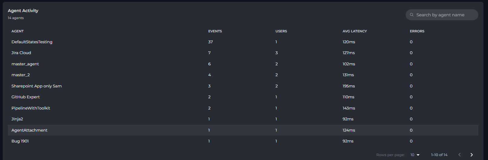 - In the Agent Activity table, sort mentally by the Events column (highest first by default) to find heavily used agents.