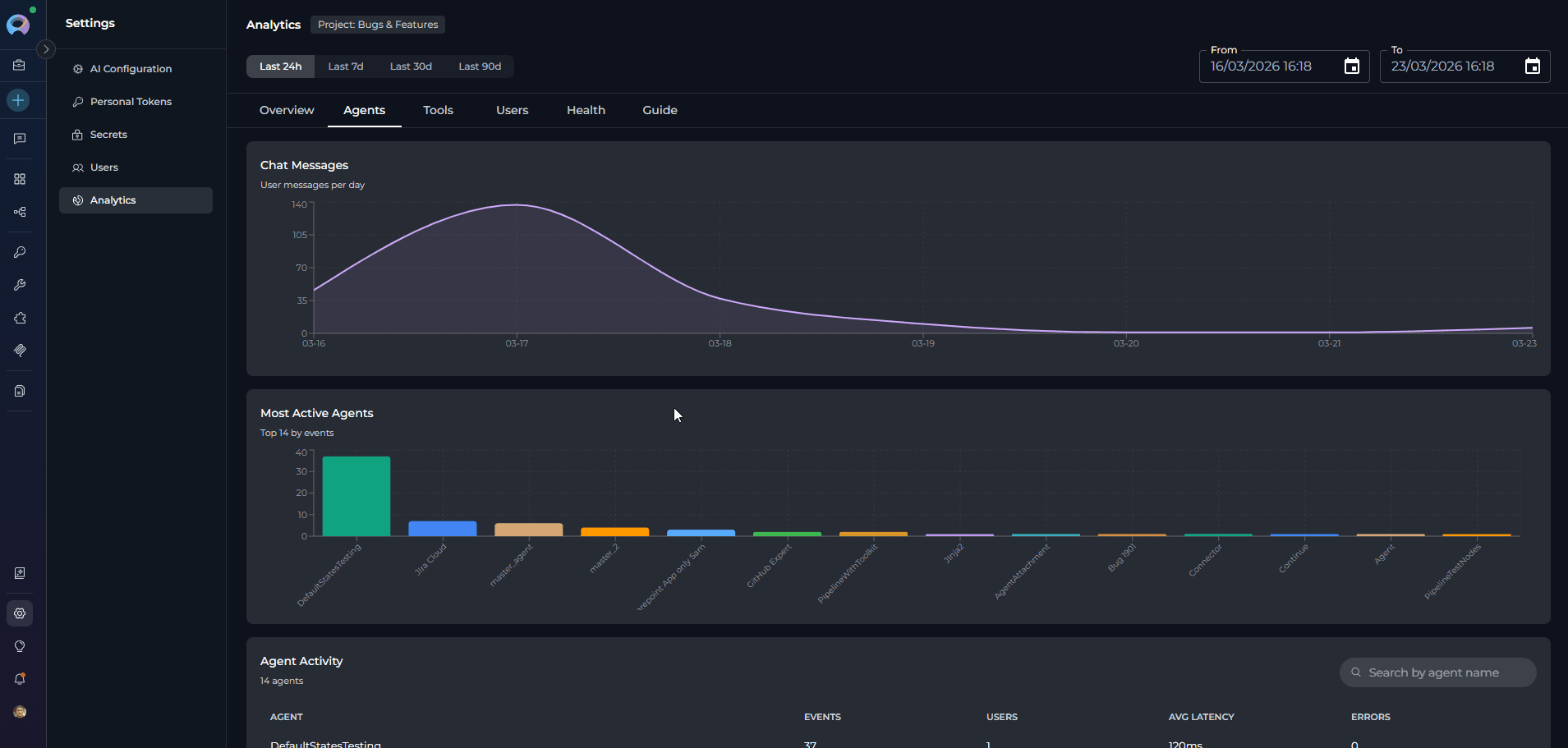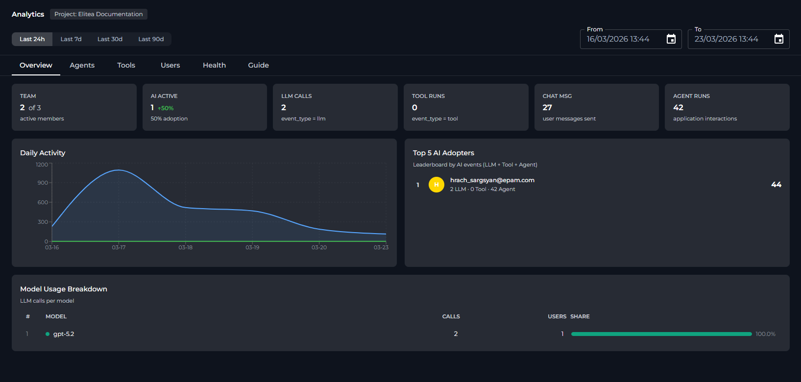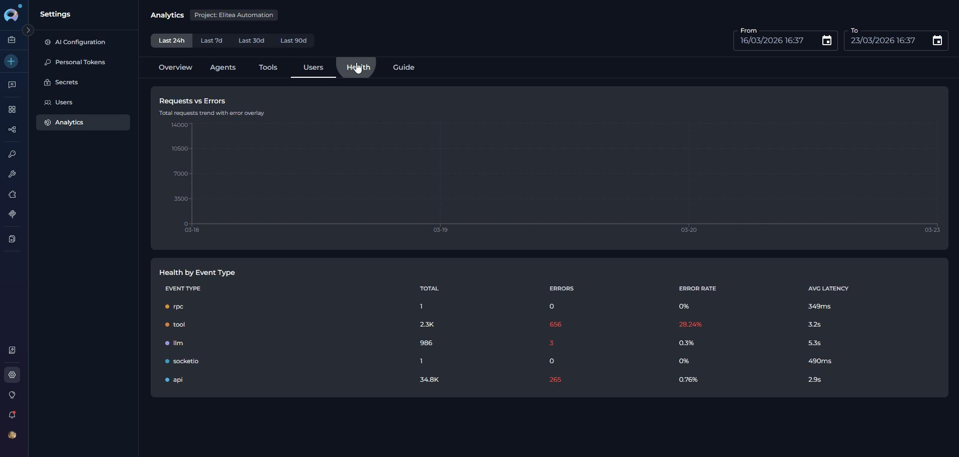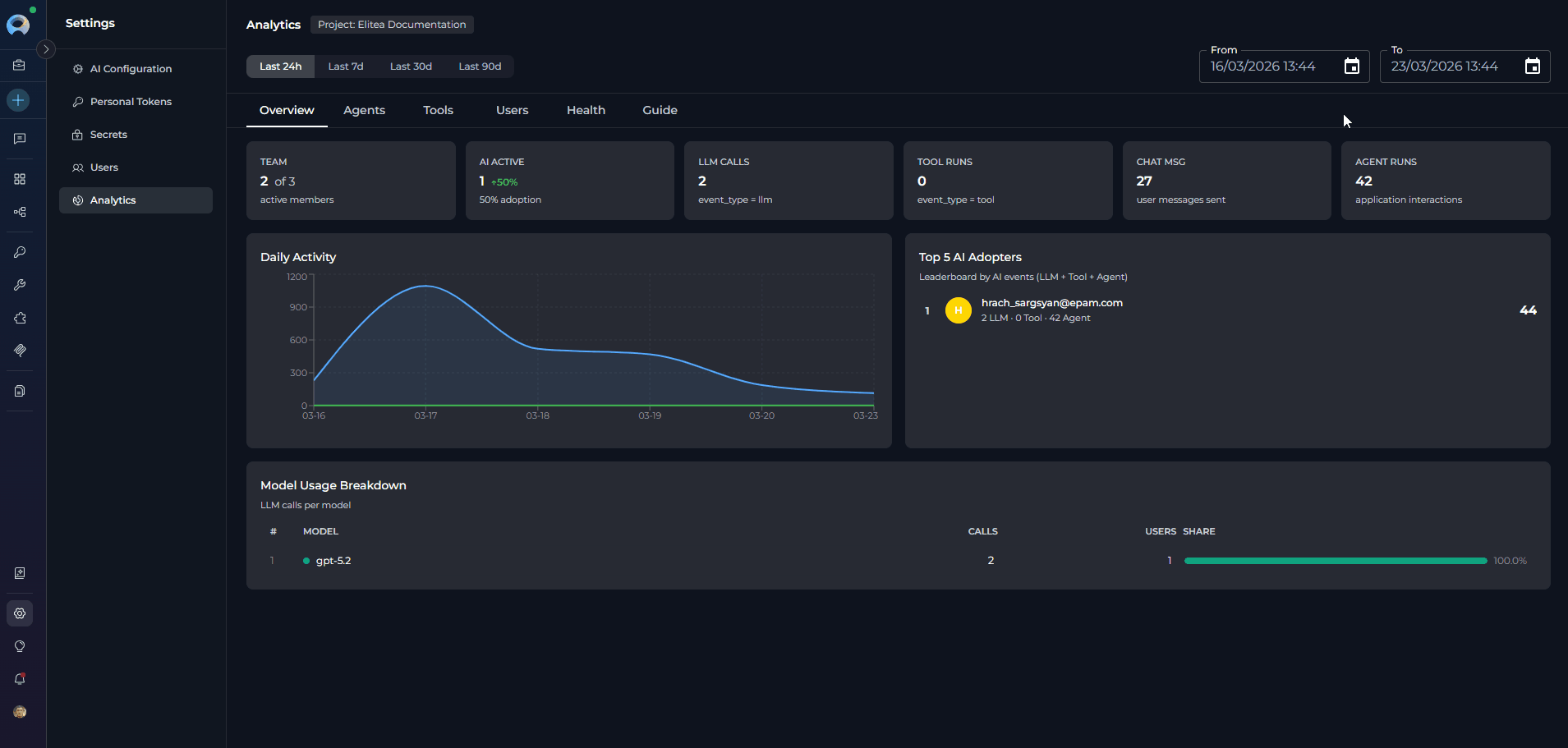 The Analytics feature in ELITEA provides detailed, real-time visibility into how your team uses the platform — from AI model invocations and tool executions to individual user activity and overall system health. Access Analytics through the Settings menu to understand adoption, diagnose performance issues, and drive continuous improvement across your project.