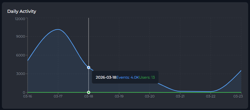 - Review the Daily Activity area chart to see on which days they were most active and which event types dominate.