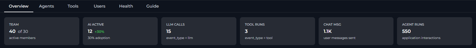 - Tab bar — A row of six tabs (Overview, Agents, Tools, Users, Health, Guide) used to switch between different analytics views.