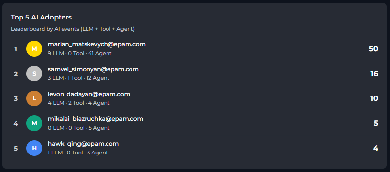 Top 5 AI Adopters — Leaderboard table showing the five users with the most combined AI events (LLM + Tool + Agent). Each row displays: