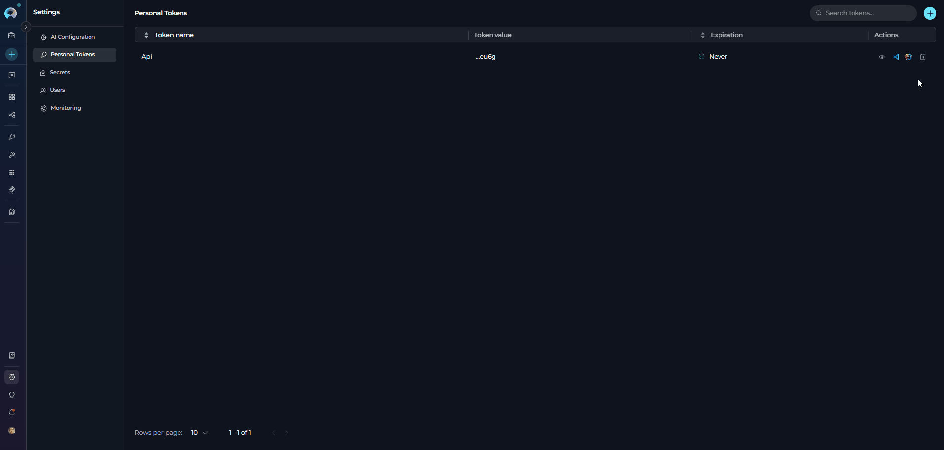 The Personal Tokens section allows you to create and manage personal access tokens for API access and IDE integrations. These tokens enable secure communication between your development environments (VSCode, JetBrains IDEs) and ELITEA's backend services.