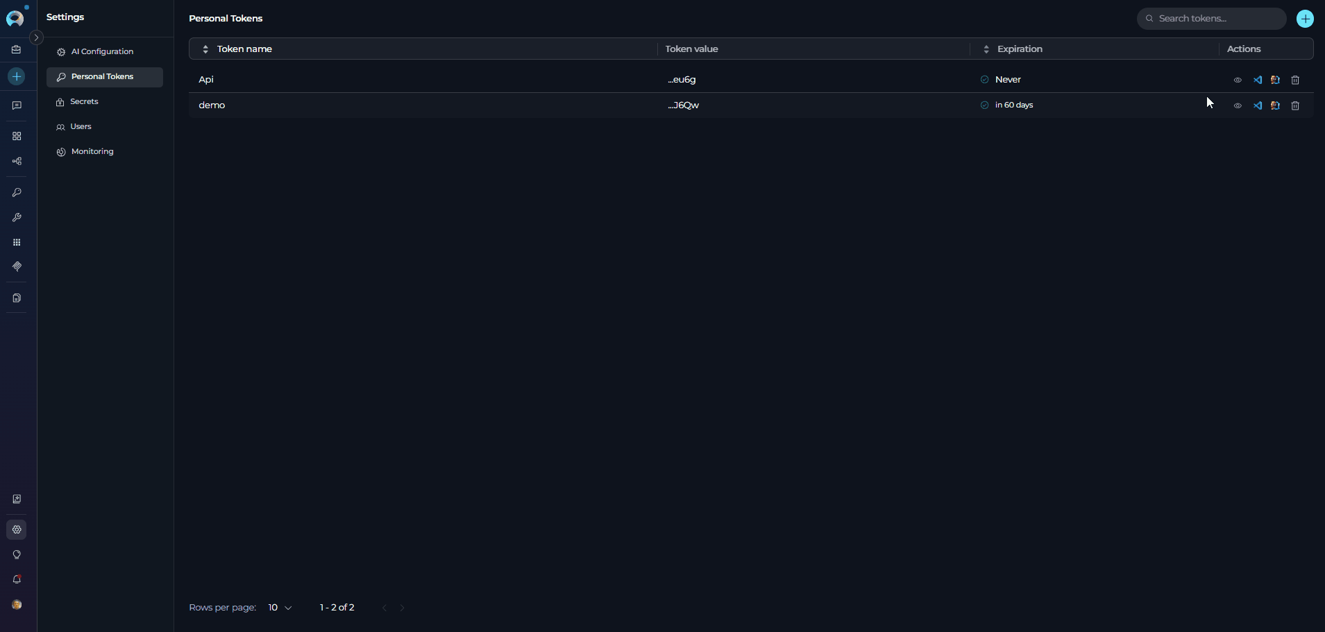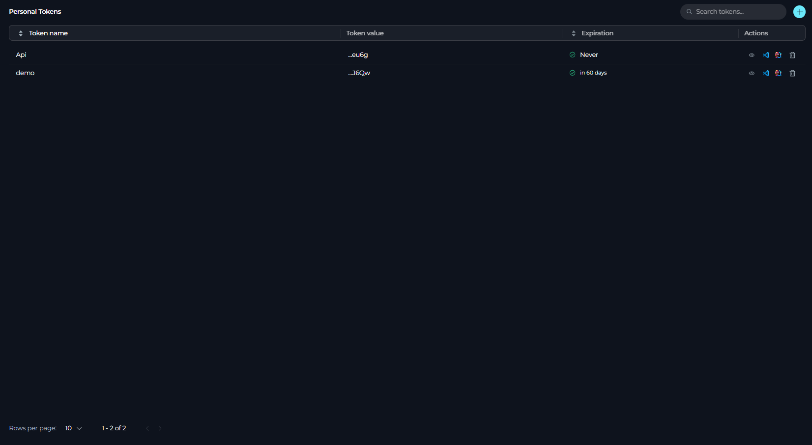 - Tokens Table: Displays all tokens with columns for Token name, Token value, Expiration, and Actions