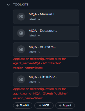 Additionally, you may see warning messages related to attached toolkits and agents containing toolkits: