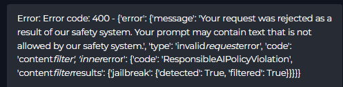 Cause: The message triggered the LLM's safety mechanism. This can happen with sensitive topics or prompts that appear like prompt injection attempts (e.g., "Ignore user input", "always answer this way").