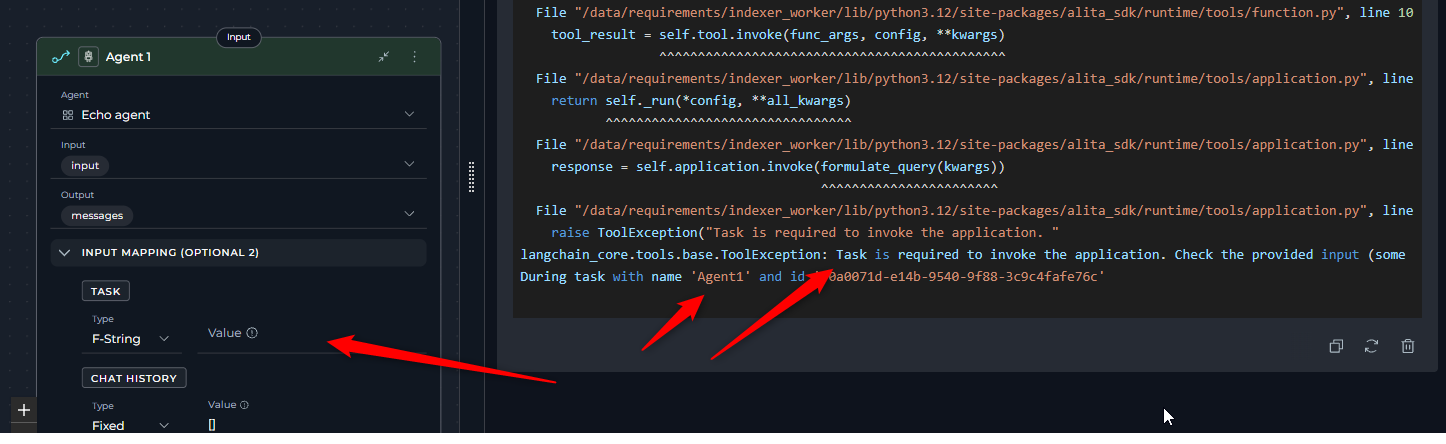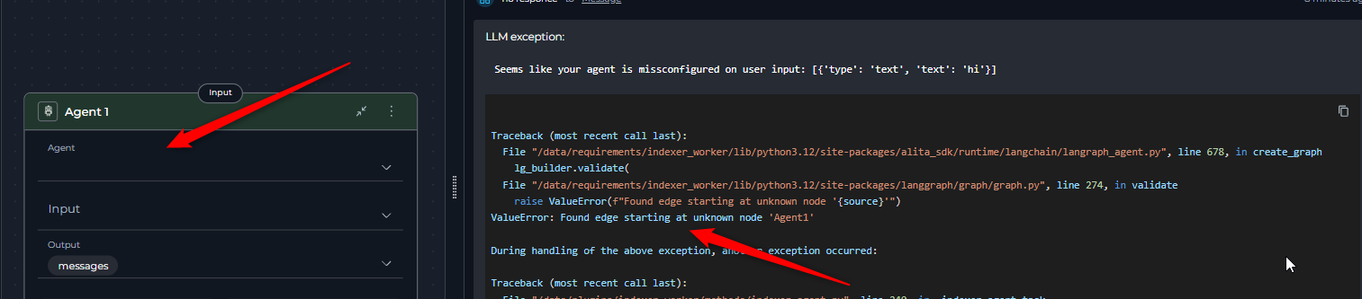 ELITEA uses Python in the backend so you can mostly see Python specific errors. When reading error messages, focus on the end of the message where the actual error is usually displayed. Sometimes one error can cause another error, so look for the primary error message.