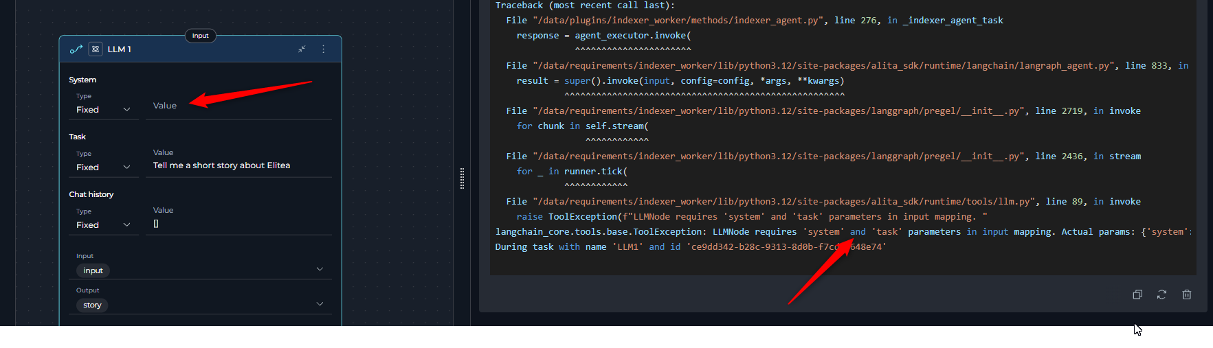 langchain_core.tools.base.ToolException: LLMNode requires 'system' and 'task' parameters in input mapping. Actual params: {'system': '', 'task': 'Tell me a short story about Elitea ', 'chat_history': []}