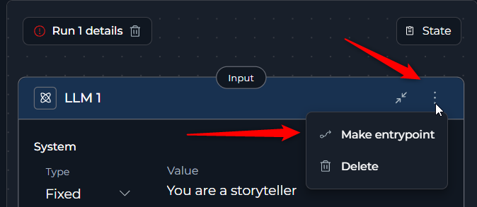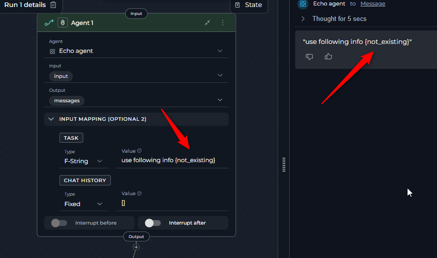 For pipelines, error messages often specify the node name (e.g., "During task with name 'Agent3'"). You can run the pipeline in the configuration tab where nodes are highlighted during execution, helping you identify where the failure occurred. Use the Run details button on top of the flow to see current state variable values and which node stopped the pipeline.