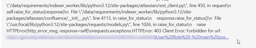 ... \"/data/requirements/indexer_worker/lib/python3.12/site-packages/atlassian/confluence/__init__.py\", line 4105, in raise_for_status\n raise HTTPError(\"Unauthorized (401)\", response=response)\nrequests.exceptions.HTTPError: Unauthorized (401)\n"...