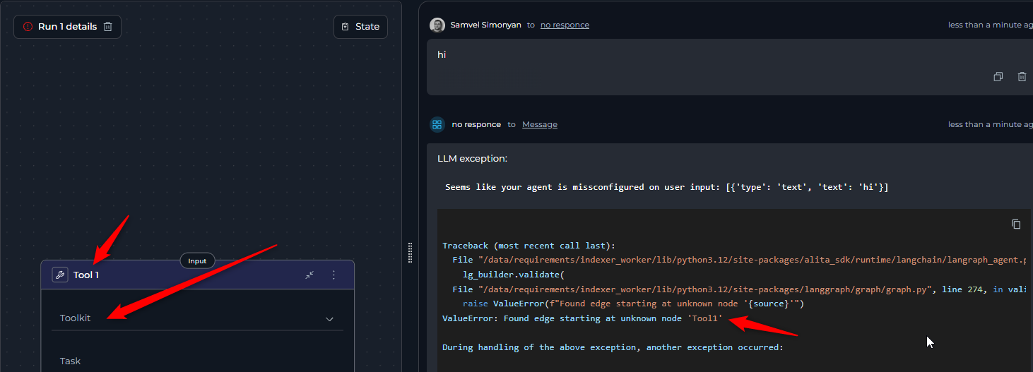 Cause: A node has no agent or toolkit selected from its dropdown.