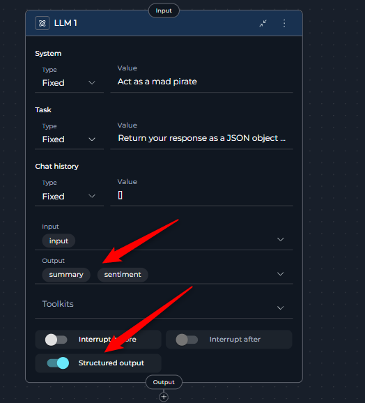 - Structured Output toggle is disabled: When structured output is off, the LLM will populate all variables with the same value (the entire response)